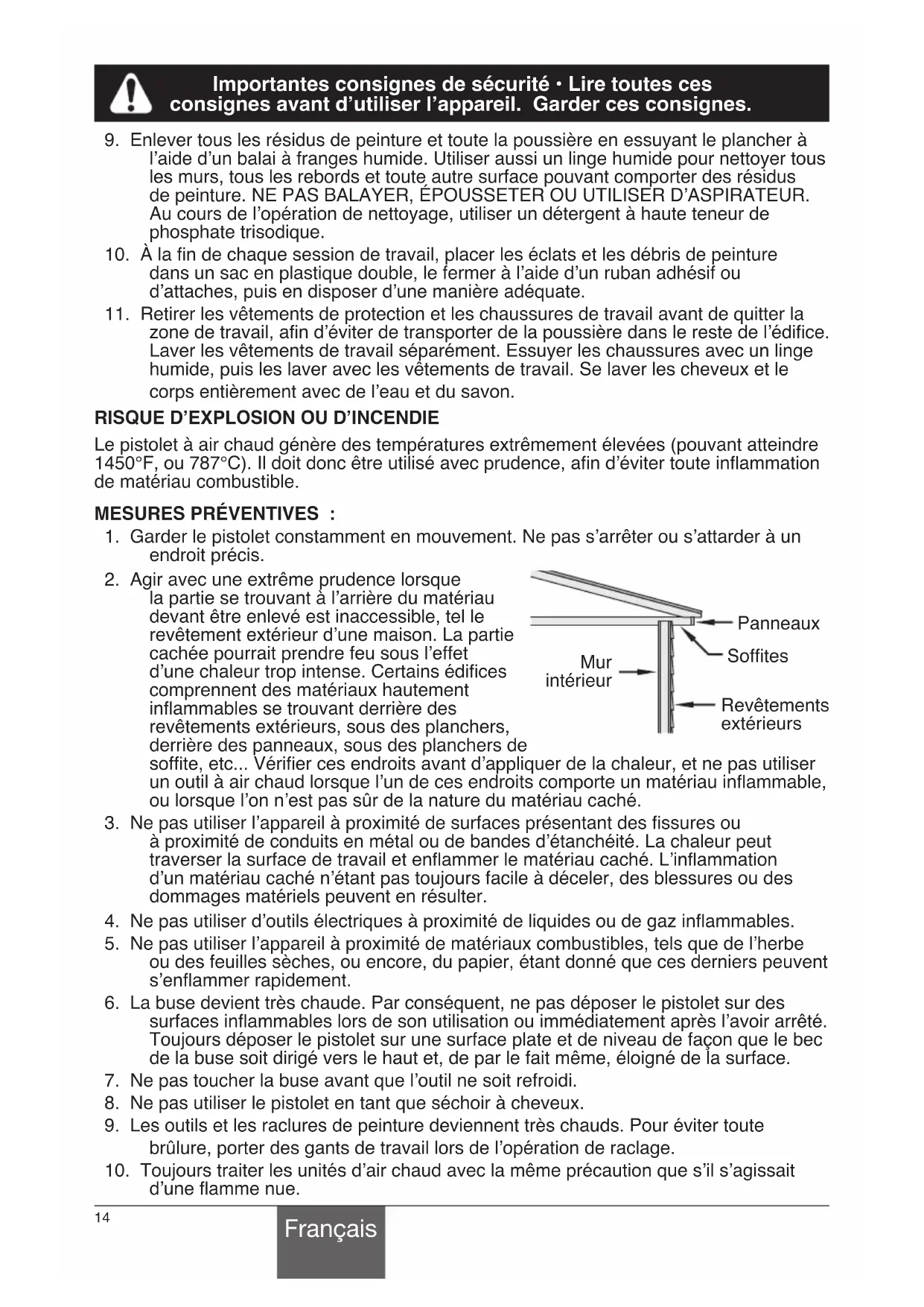 IMPORTANT : Le décapage d'une surface peinte à l'aide d'un pistolet à air chaud est une opération ne présentant aucun danger, pourvu que les directives représentées ci-dessus soient respectées. Il est néanmoins recommandé de conserver un contenant d'eau ou un extincteur ABC à portée de la main.