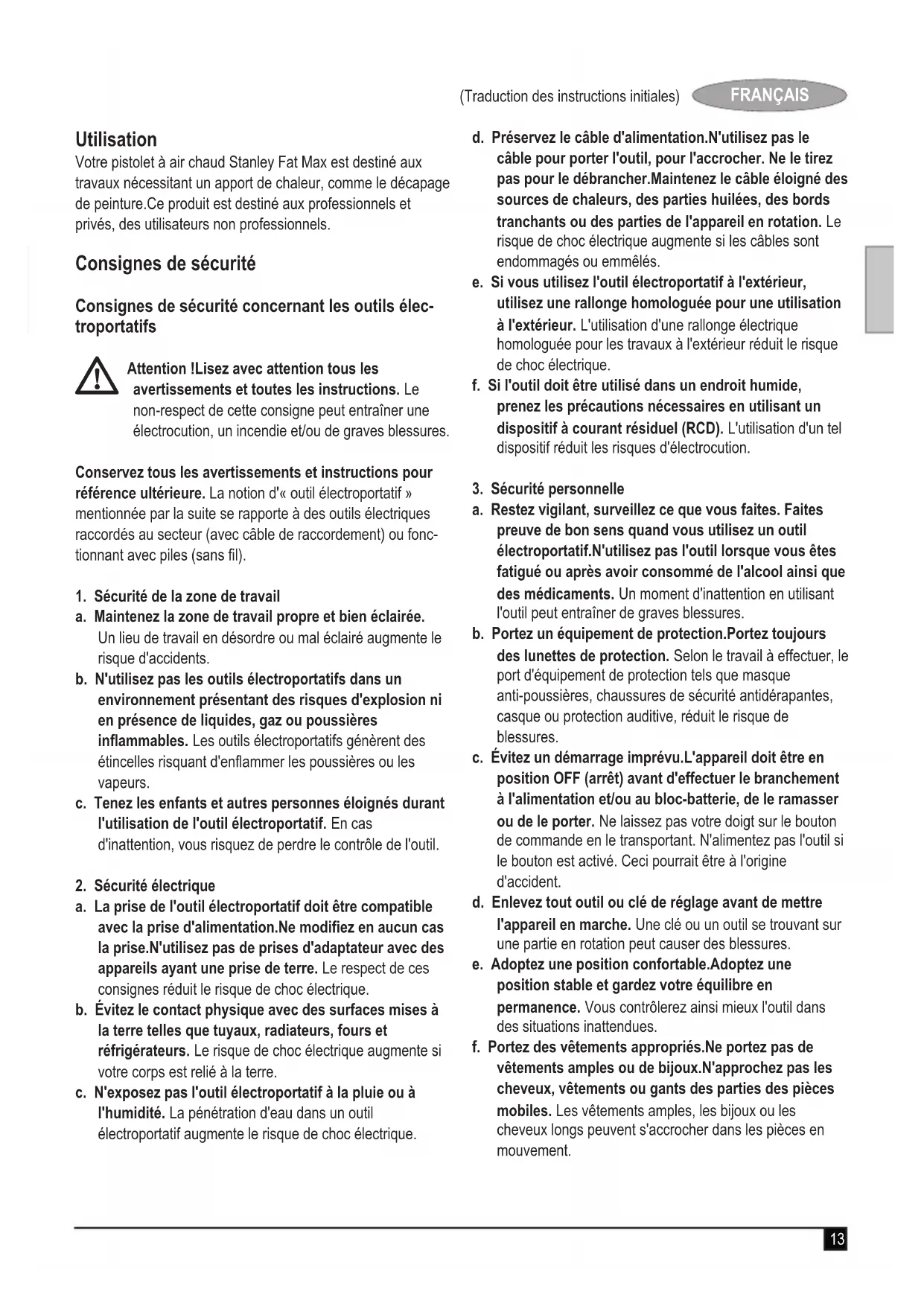 Si un produit Stanley Fat Max s'avère défectueux en raison de matériaux en mauvais état ou d'une erreur humaine dans les 12 mois suivant la date d'achat, Stanley Europe garantit le remplacement gratuit ou – à sa discrétion - des pièces défectueuses si : u Le produit a été correctement utilisé et a été utilisé en respectant les instructions du manuel. u L'usure du produit est normale ;u Les réparations ont été effectuées par des personnes agréées ; u Une preuve d'achat est donnée ;u Le produit Stanley Fat Max est réexpédié avec tous les composants d'origine. Pour toutes réclamations, recherchez l'adresse du réparateur agréé Stanley le plus proche de chez vous dans le catalogue Fat Max ou contactez le bureau local Stanley à l'adresse indiquée dans ce manuel.Une liste de réparateurs agréés Fat Max et de plus amples détails sur notre service après-vente sont disponibles sur le site Internet www.stanley.eu/318 (Traduzione del testo originale) ITALIANO Uso previsto La pistola termica Stanley Fat Max è stata ideata per varie applicazioni che richiedono la trasmissione di calore, come ad esempio la sverniciatura. Questo strumento è destinato a professionisti e private, gli utenti non professionali. Istruzioni di sicurezza Avvisi di sicurezza generici per gli elettroutensili