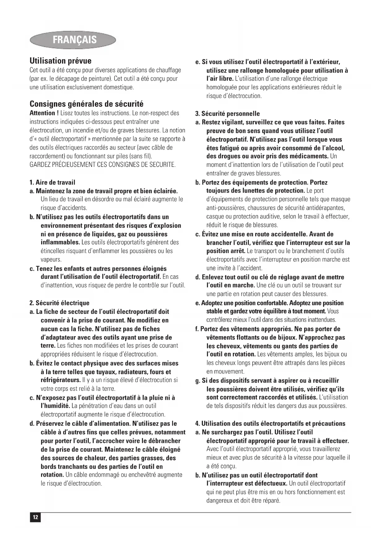 Cet outil a ete concu pour diverses applications de chauffage (par ex. le decapage de peinture). Cet outil a ete concu pour une utilisation exclusivement domestique.