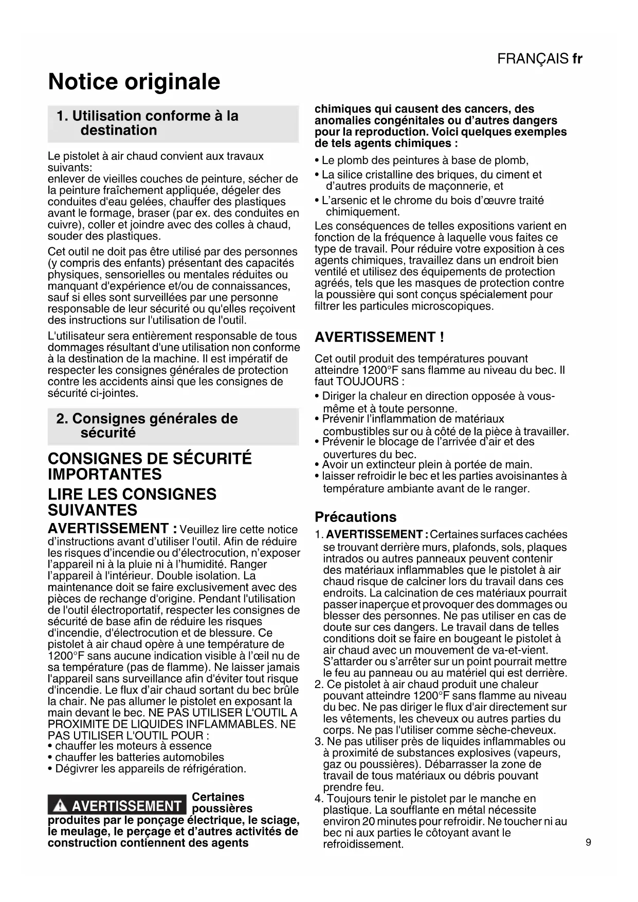 AVERTISSEMENT: Veuillez lore cette notice d'instructions avant d'utiliser l'outil. Afin de réduire les risques d'incendie ou d'électrocution, n'exposer l'appareil ni à la pluie ni à l'humidité. Ranger l'appareil à l'intérieur. Double isolation. La maintenance doit se faire exclusivement avec des pieces de rechange d'origine. Pendant l'utilisation de l'outil electroportatif, respecter les consignes de sécurité de base afin de réduire les risques d'incendie, d'électrocution et de blessure. Ce pistolet à air chaud opéré à une température de 1200^ sans aucune indication visible à l'eel nu de sa température (pas de flamme). Ne laisser jamais l'appareil sans surveillance afin d'éviter tout risque d'incendie. Le flux d'air chaud sortant du bac brûle la chair. Ne pas allumer le pistolet en exposant la main devant le bac. NE PAS UTILISER L'OUTIL A PROXIMATE DE LIQUIDES INFLAMMABLES. NE PAS UTILISER L'OUTIL POUR: