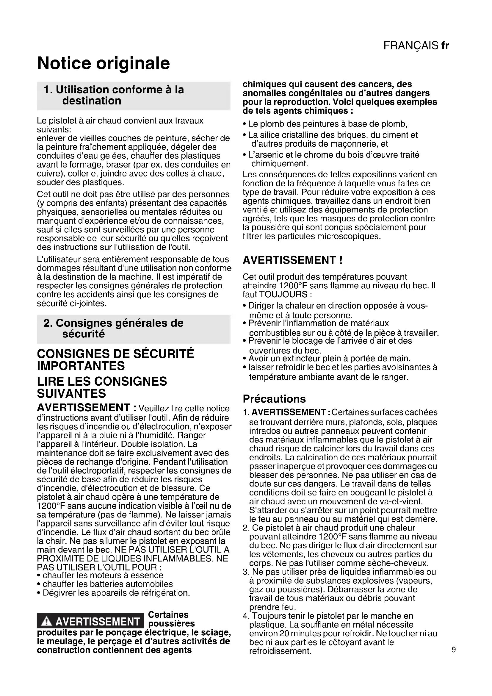 - AVERTISSEMENT: Certaines surfaces cachées se trouvant derrière murs, plafonds, sols, plaques intrados ou autres panneaux peuventContainir des materiaux inflammables que le pistolet à air chaud risque de calciner lors du travail dans ces endroits. La calcination de ces materiaux pourrait passer inaperçue et provoquer des dommages ou blesser des personnes. Ne pas utiliser en cas de doute sur ces dangere. Le travail dans de telles conditions doit se faire en bougeant le pistolet à air chaud avec un mouvement de va-et-vient. S'attarder ou s'arreter sur un point pourraitmettre le feu au panneau ou au matériel qui est derriere.