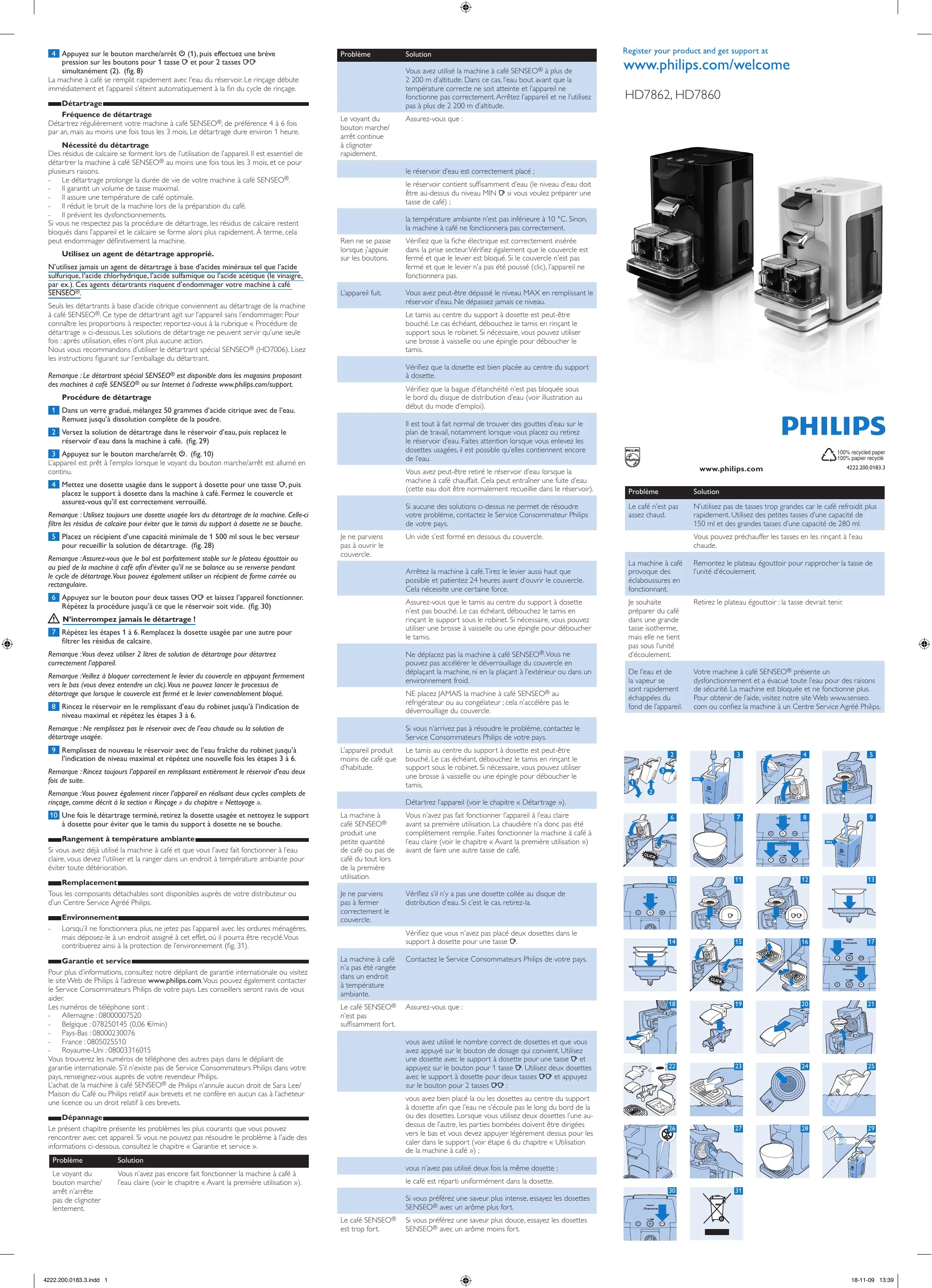 Utilisez un agent de détartrage approprié. N’utilisez jamais un agent de détartrage à base d’acides minéraux tel que l’acide sulfurique, l’acide chlorhydrique, l’acide sulfamique ou l’acide acétique (le vinaigre, par ex.). Ces agents détartrants risquent d’endommager votre machine à café SENSEO®. Vous avez utilisé la machine à café SENSEO® à plus de 2 200 m d’altitude. Dans ce cas, l’eau bout avant que la température correcte ne soit atteinte et l’appareil ne fonctionne pas correctement. Arrêtez l’appareil et ne l’utilisez pas à plus de 2 200 m d’altitude. Le voyant du bouton marche/ arrêt continue à clignoter rapidement. le réservoir contient suffisamment d’eau (le niveau d’eau doit être au-dessus du niveau MIN q si vous voulez préparer une tasse de café) ; la température ambiante n’est pas inférieure à 10 °C. Sinon, la machine à café ne fonctionnera pas correctement. Rien ne se passe lorsque j’appuie sur les boutons. Vérifiez que la fiche électrique est correctement insérée dans la prise secteur. Vérifiez également que le couvercle est fermé et que le levier est bloqué. Si le couvercle n’est pas fermé et que le levier n’a pas été poussé (clic), l’appareil ne fonctionnera pas. L’appareil fuit. Vous avez peut-être dépassé le niveau MAX en remplissant le réservoir d’eau. Ne dépassez jamais ce niveau. Le tamis au centre du support à dosette est peut-être bouché. Le cas échéant, débouchez le tamis en rinçant le support sous le robinet. Si nécessaire, vous pouvez utiliser une brosse à vaisselle ou une épingle pour déboucher le tamis. Vérifiez que la dosette est bien placée au centre du support à dosette. Remarque : Le détartrant spécial SENSEO® est disponible dans les magasins proposant des machines à café SENSEO® ou sur Internet à l’adresse www.philips.com/support. Vérifiez que la bague d’étanchéité n’est pas bloquée sous le bord du disque de distribution d’eau (voir illustration au début du mode d’emploi). Procédure de détartrage 1 Dans un verre gradué, mélangez 50 grammes d’acide citrique avec de l’eau. Remuez jusqu’à dissolution complète de la poudre. Il est tout à fait normal de trouver des gouttes d’eau sur le plan de travail, notamment lorsque vous placez ou retirez le réservoir d’eau. Faites attention lorsque vous enlevez les dosettes usagées, il est possible qu’elles contiennent encore de l’eau. 2 Versez la solution de détartrage dans le réservoir d’eau, puis replacez le réservoir d’eau dans la machine à café. (fig. 29) 3 Appuyez sur le bouton marche/arrêt 3. (fig. 10) L’appareil est prêt à l’emploi lorsque le voyant du bouton marche/arrêt est allumé en continu. Vous avez peut-être retiré le réservoir d’eau lorsque la machine à café chauffait. Cela peut entraîner une fuite d’eau (cette eau doit être normalement recueillie dans le réservoir). 4 Mettez une dosette usagée dans le support à dosette pour une tasse q, puis placez le support à dosette dans la machine à café. Fermez le couvercle et assurez-vous qu’il est correctement verrouillé. Si aucune des solutions ci-dessus ne permet de résoudre votre problème, contactez le Service Consommateur Philips de votre pays. Remarque : Utilisez toujours une dosette usagée lors du détartrage de la machine. Celle-ci filtre les résidus de calcaire pour éviter que le tamis du support à dosette ne se bouche. Remarque : Assurez-vous que le bol est parfaitement stable sur le plateau égouttoir ou au pied de la machine à café afin d’éviter qu’il ne se balance ou se renverse pendant le cycle de détartrage.Vous pouvez également utiliser un récipient de forme carrée ou rectangulaire. Je ne parviens pas à ouvrir le couvercle. Assurez-vous que le tamis au centre du support à dosette n’est pas bouché. Le cas échéant, débouchez le tamis en rinçant le support sous le robinet. Si nécessaire, vous pouvez utiliser une brosse à vaisselle ou une épingle pour déboucher le tamis. N’interrompez jamais le détartrage ! 7 Répétez les étapes 1 à 6. Remplacez la dosette usagée par une autre pour filtrer les résidus de calcaire. Remarque :Vous devez utiliser 2 litres de solution de détartrage pour détartrez correctement l’appareil. Ne déplacez pas la machine à café SENSEO®. Vous ne pouvez pas accélérer le déverrouillage du couvercle en déplaçant la machine, ni en la plaçant à l’extérieur ou dans un environnement froid. Remarque :Veillez à bloquer correctement le levier du couvercle en appuyant fermement vers le bas (vous devez entendre un clic).Vous ne pouvez lancer le processus de détartrage que lorsque le couvercle est fermé et le levier convenablement bloqué. NE placez JAMAIS la machine à café SENSEO® au réfrigérateur ou au congélateur ; cela n’accélère pas le déverrouillage du couvercle. 8 Rincez le réservoir en le remplissant d’eau du robinet jusqu’à l’indication de niveau maximal et répétez les étapes 3 à 6. Remarque : Ne remplissez pas le réservoir avec de l’eau chaude ou la solution de détartrage usagée. Remarque : Rincez toujours l’appareil en remplissant entièrement le réservoir d’eau deux fois de suite. Rangement à température ambiante Si vous avez déjà utilisé la machine à café et que vous l’avez fait fonctionner à l’eau claire, vous devez l’utiliser et la ranger dans un endroit à température ambiante pour éviter toute détérioration. Remplacement Tous les composants détachables sont disponibles auprès de votre distributeur ou d’un Centre Service Agréé Philips.