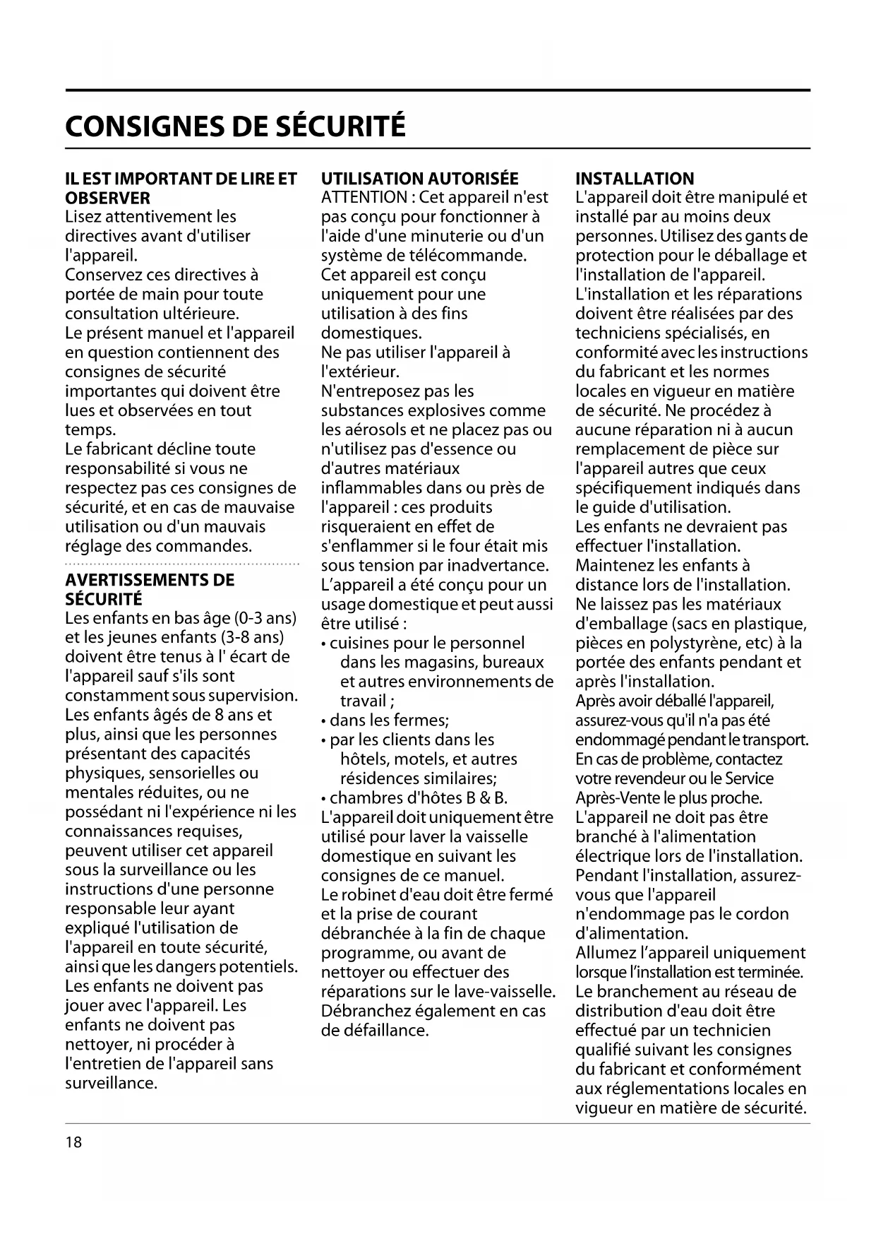 - chambres d'hôtes B & B. L'appareil doit uniquement être utilisé pour laver la vaisselle domestique en suivant les consignes de ce manuel. Le robinet d'eau doit être fermé et la prise de courant débranchée à la fin de chaque programme, ou avant de nettoyer ou effectuer des réparations sur le lave-vaisselle. Débranchez également en cas de défaillance. INSTALLATION L'appareil doit être manipulé et installé par au moins deux personnes. Utilisez des gants de protection pour le déballage et l'installation de l'appareil. L'installation et les réparations doivent être réalisées par des techniciens spécialisés, en conformité avec les instructions du fabricant et les normes locales en vigueur en matière de sécurité. Ne procédez à aucune réparation ni à aucun remplacement de pièce sur l'appareil autres que ceux spécifiquement indiqués dans le guide d'utilisation. Les enfants ne devraient pas effectuer l'installation. Maintenez les enfants à distance lors de l'installation. Ne laissez pas les matériaux d'emballage (sacs en plastique, pièces en polystyrène, etc) à la portée des enfants pendant et après l'installation. Après avoir déballé l'appareil, assurez-vous qu'il n'a pas été endommagé pendant le transport. En cas de problème, contactez votre revendeur ou le Service Après-Vente le plus proche. L'appareil ne doit pas être branché à l'alimentation électrique lors de l'installation. Pendant l'installation, assurez- vous que l'appareil n'endommage pas le cordon d'alimentation. Allumez l’appareil uniquement lorsque l’installation est terminée. Le branchement au réseau de distribution d'eau doit être effectué par un technicien qualifié suivant les consignes du fabricant et conformément aux réglementations locales en vigueur en matière de sécurité.19 L'appareil doit être branché à la conduite principale en utilisant de nouveaux tuyaux. Évitez de réutiliser des tuyaux usagés. Un collier doit être fermement fixé sur tous les tuyaux afin que ces derniers ne se desserrent pas lors du fonctionnement de l'appareil. Respectez les normes en vigueur de la société locale de distribution d'eau. Pression d'alimentation en eau : 0,05 - 1,0 MPa. La température d'entrée d'eau dépend du modèle du lave- vaisselle. Si le tuyau d'alimentation indique « max 25°C », la température maximum de l'eau ne doit pas dépasser 25°C. Pour tous les autres modèles, la température de l'eau permise est de 60°C. Ne coupez pas les flexibles et, en présence d'un appareil avec système de coupure de l'arrivée d'eau, ne plongez pas dans l'eau le boîtier en plastique de raccordement au réseau hydrique. Si les tuyaux sont trop courts, adressez-vous à votre revendeur. Assurez-vous que les tuyaux d'alimentation et de vidange ne sont ni pliés ni tordus. Avant toute utilisation, vérifiez l'étanchéité des tuyaux d' alimentation et de vidange de l'eau. Pendant l'utilisation, l'accès au mur arrière doit être limité, notamment en approchant le plus possible l'appareil du mur ou du meuble. Lors de l'installation de l'appareil, assurez-vous que les quatre supports sont stables et reposent sur le sol, en les ajustant au besoin, et assurez- vous que l'appareil est parfaitement de niveau en utilisant un niveau à bulle. Si l'appareil est installé à l'extrémité d'une rangée d'unités et que sa paroi latérale est exposée, protégez les charnières pour éviter qu'elle ne soit endommagée. Pour les lave-vaisselles avec des ouvertures à la base pour la ventilation, les ouvertures ne doivent pas être bloquées par un tapis. AVERTISSEMENTS ÉLECTRIQUES Pour que l'installation soit conforme à la réglementation en vigueur en matière de sécurité, un interrupteur omnipolaire avec un intervalle de contact minimum de 3 mm est requis, et la mise à la terre de l'appareil est obligatoire. Si le câble d'alimentation est endommagé, remplacez-le avec un câble identique. Le câble électrique ne doit être remplacé que par un technicien qualifié conformément aux directives du fabricant et aux normes de sécurité en vigueur. Adressez-vous à un Service Après-vente agréé. Si la fiche installée n'est pas adaptée pour votre prise, contactez un technicien qualifié. Une fois l'appareil installé dans son meuble, le câble d'alimentation doit être suffisamment long pour le brancher à l'alimentation électrique principale. Ne tirez pas sur le câble d'alimentation. N'utilisez pas de rallonge, de multiprise, ou d'adaptateurs. N'utilisez en aucun cas cet appareil si le cordon d'alimentation ou la prise de courant est endommagé, si l'appareil ne fonctionne pas correctement ou s'il a été endommagé ou est tombé. Éloignez le cordon des surfaces chaudes. Une fois l'installation terminée, l'utilisateur ne doit plus pouvoir accéder aux composantes électriques. Évitez de toucher l'appareil si vous êtes mouillé, et ne l'utilisez pas si vous êtes pieds nus. UTILISATION CORRECTE L'eau du lave-vaisselle n'est pas potable. Le nombre maximum de places est indiqué sur la fiche produit. La porte de devrait pas être laissée ouverte; vous pourriez trébucher dessus. La porte ouverte ne peut porter que le panier à vaisselle (chargé de vaisselle). N'appuyez pas d'objet sur la porte, ne vous asseyez pas et ne montez pas dessus. Utilisez uniquement des détergents et des produits de rinçage conçus pour un lave- vaisselle automatique.