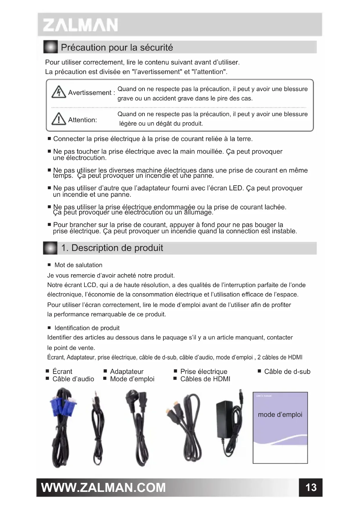 ■ Mot de salutation Je vous remercie d’avoir acheté notre produit.Notre écrant LCD, qui a de haute résolution, a des qualités de l’interruption parfaite de l’onde électronique, l’économie de la consommation électrique et l’utilisation ecace de l’espace.Pour utiliser l’écran correctement, lire le mode d’emploi avant de l’utiliser an de proterla performance remarquable de ce produit. ■ Identication de produit Identier des articles au dessous dans le paquage s’il y a un article manquant, contacter le point de vente.Écrant, Adaptateur, prise électrique, câble de d-sub, câble d’audio, mode d’emploi , 2 câbles de HDMI mode d’emploi Écrant Adaptateur Prise électrique Câble de d-sub