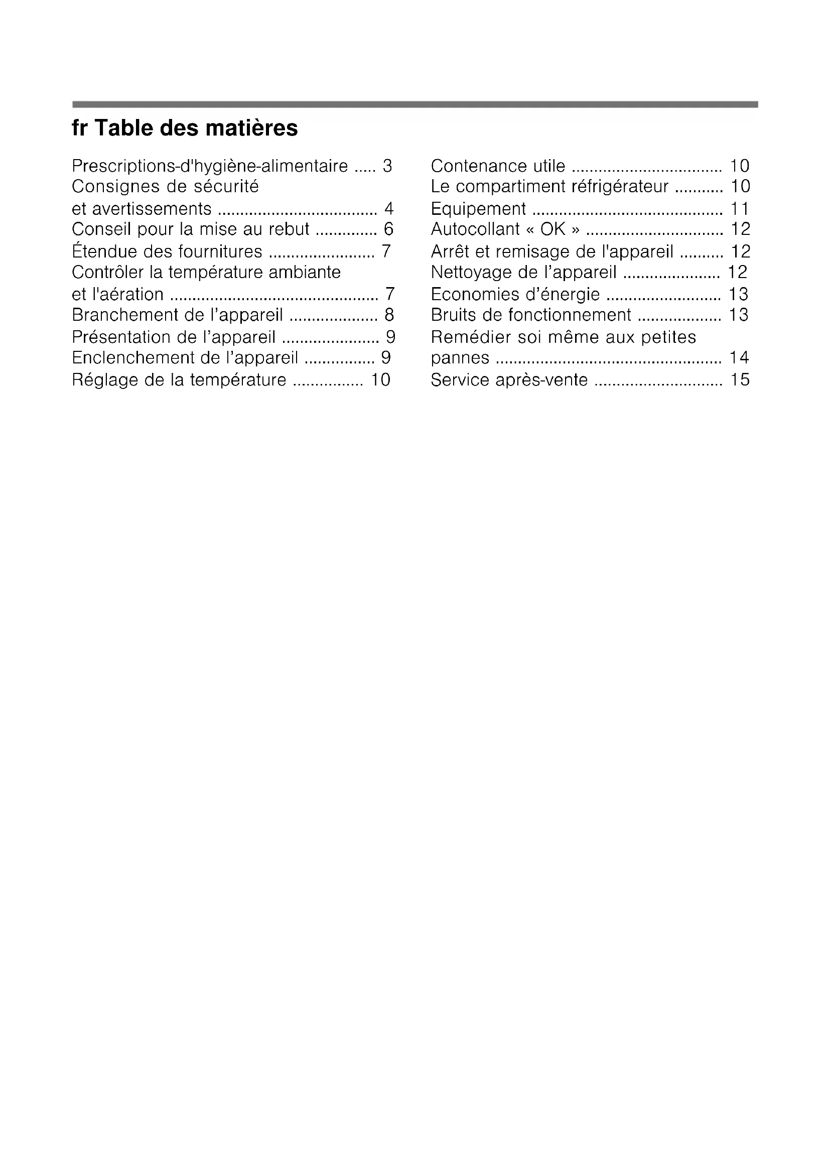 fr Table d es mat ières frMode d’emploi Prescriptions- d'hygiène-alimentaire Chère cliente, cher client, Conformément à la réglementation française visant à empêcher la présence de listéries dans le compartiment réfrigérateur, nous vous remercions de respecter les consignes suivantes : ■ Nettoyez fréquemment le compartiment intérieur du réfrigérateur à l'aide d'un détergent non agressif, ne provoquant pas d'oxydati on des pièces métalliques (utilisez par ex. de l'eau tiède additionnée d'un peu de produit à vaisselle). Ensuite, désinfectez avec de l’eau additionnée de vinaigre ou de jus de citron les surfaces que vous avez préalablement nettoyées, ou utilisez un produit germicide en vente habituelle dans le commerce et adapté aux réfrigérateurs (avant d’utiliser ce produit sur les pièces métalliques, faites un test de compatibilité à un endroit peu visible). ■ Enlevez les emballages commerciaux avant de mettre les produits alimentaires dans le compartiment réfrigérateur (par ex. le carton qui réunit les pots de yaourt). ■ Pour éviter toute contamination entre des produits alimentaires de nature différente, rangez-les bien séparés les uns des autres, bien emballés ou rangés dans des récipients à couvercle. ■ Avant de préparer des plats et de saisir des produits alimentaires, lavez- vous les mains. Avant de préparer d’autres plats, lavez-vous à nouveau les mains. Lavez-les encore une fois avant de prendre un repas. ■ Lavez les ustensiles de cuisine dont vous venez de vous servir avant de les réutiliser (cuillère en bois, planche de découpe, couteau de cuisine, etc.).fr