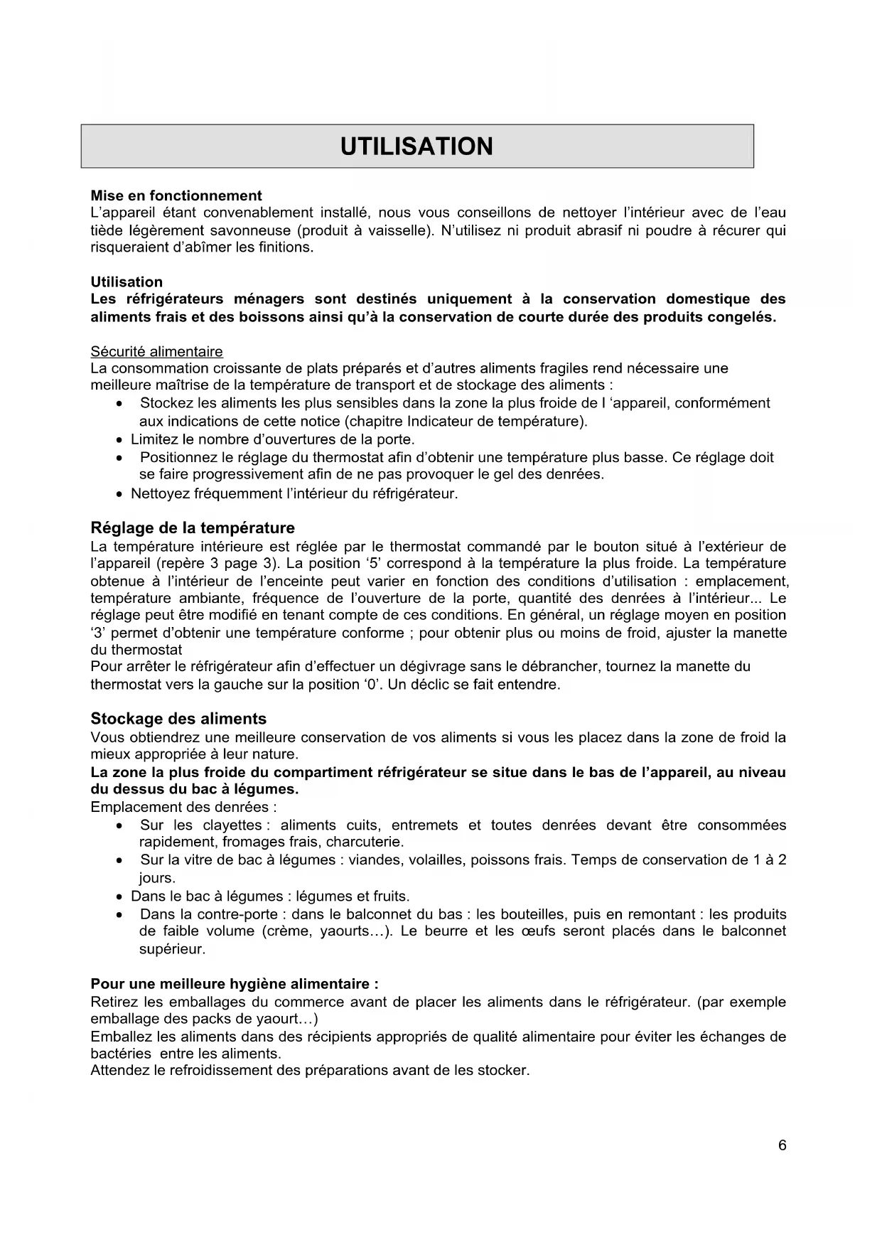 UTILISATION Mise en fonctionnement L’appareil étant convenablement installé, nous vous conseillons de nettoyer l’intérieur avec de l’eau tiède légèrement savonneuse (produit à vaisselle). N’utilisez ni produit abrasif ni poudre à récurer qui risqueraient d’abîmer les finitions. Utilisation Les réfrigérateurs ménagers sont destinés uniquement à la conservation domestique des aliments frais et des boissons ainsi qu’à la conservation de courte durée des produits congelés. Sécurité alimentaire La consommation croissante de plats préparés et d’autres aliments fragiles rend nécessaire une meilleure maîtrise de la température de transport et de stockage des aliments : x Stockez les aliments les plus sensibles dans la zone la plus froide de l ‘appareil, conformément aux indications de cette notice (chapitre Indicateur de température). x Limitez le nombre d’ouvertures de la porte. x Positionnez le réglage du thermostat afin d’obtenir une température plus basse. Ce réglage doit se faire progressivement afin de ne pas provoquer le gel des denrées. x Nettoyez fréquemment l’intérieur du réfrigérateur. Réglage de la température La température intérieure est réglée par le thermostat commandé par le bouton situé à l’extérieur de l’appareil (repère 3 page 3). La position ‘5’ correspond à la température la plus froide. La température obtenue à l’intérieur de l’enceinte peut varier en fonction des conditions d’utilisation : emplacement, température ambiante, fréquence de l’ouverture de la porte, quantité des denrées à l’intérieur... Le réglage peut être modifié en tenant compte de ces conditions. En général, un réglage moyen en position ‘3’ permet d’obtenir une température conforme ; pour obtenir plus ou moins de froid, ajuster la manette du thermostat Pour arrêter le réfrigérateur afin d’effectuer un dégivrage sans le débrancher, tournez la manette du thermostat vers la gauche sur la position ‘0’. Un déclic se fait entendre. Stockage des aliments Vous obtiendrez une meilleure conservation de vos aliments si vous les placez dans la zone de froid la mieux appropriée à leur nature. La zone la plus froide du compartiment réfrigérateur se situe dans le bas de l’appareil, au niveau du dessus du bac à légumes. Emplacement des denrées : x Sur les clayettes : aliments cuits, entremets et toutes denrées devant être consommées rapidement, fromages frais, charcuterie. x Sur la vitre de bac à légumes : viandes, volailles, poissons frais. Temps de conservation de 1 à 2 jours. x Dans le bac à légumes : légumes et fruits. x Dans la contre-porte : dans le balconnet du bas : les bouteilles, puis en remontant : les produits de faible volume (crème, yaourts…). Le beurre et les œufs seront placés dans le balconnet supérieur. Pour une meilleure hygiène alimentaire : Retirez les emballages du commerce avant de placer les aliments dans le réfrigérateur. (par exemple emballage des packs de yaourt…) Emballez les aliments dans des récipients appropriés de qualité alimentaire pour éviter les échanges de bactéries entre les aliments. Attendez le refroidissement des préparations avant de les stocker.7 COMPARTIMENT CONGELATEUR Le compartiment congélateur permet la congélation des produits frais ainsi que la conservation des produits congelés. La quantité des aliments à congeler ne doit pas dépasser la quantité inscrite sur la plaque signalétique. Si la quantité à congeler est supérieure à cette valeur, il est toujours possible d’effectuer la congélation en plusieurs fois. Congélation des produits frais i Congelez exclusivement des produits de première qualité après les avoir nettoyés et préparés si nécessaire. i Laissez les plats cuisinés refroidir à la température ambiante avant de les introduire dans le congélateur. i Tous les produits à congeler devront être emballés dans des sachets de polyéthylène, des barquettes d’aluminium « spécial congélation », des boîtes en plastique. Ces emballages doivent être hermétiques. i Chaque paquet doit être proportionné à l’importance de la consommation familiale de manière à être utilisés en une seule fois. Des paquets de petites dimensions permettent d’obtenir une congélation rapide et uniforme. i Ne pas congeler en une seule fois une quantité de produit supérieure à la capacité de congélation de l’appareil indiquée sur la plaque signalétique. i Un produit décongelé ne doit jamais être recongelé. i Ne pas placer dans le congélateur des liquides dans les emballages en verre, des bouteilles ou boîtes de boissons gazeuses, elles pourraient éclater. i Ne consommez pas les bâtonnets glacés dès leur sortie du congélateur pour éviter les brûlures dues au froid. Pour congeler des produits frais : Régler le thermostat pour obtenir une température la plus basse possible sans pour autant que celle-ci n’atteigne une valeur inférieure à 0° dans le réfrigérateur. N’ouvrez pas la porte du congélateur pendant l’opération de congélation Laissez l’appareil en régime de congélation pendant 24 heures, puis, au bout de ce laps de temps, replacez le bouton du thermostat en position moyenne. Conservation des produits congelés i Les produits congelés peuvent être regroupés, afin de laisser libres les espaces pour la congélation. i Quand vous achetez un produit surgelé, assurez-vous que l’emballage est intact, qu’il ne présente aucune trace d’humidité, qu’il n’est pas gonflé, ce qui serait le signe d’un début de décongélation. i Respectez la durée de conservation indiquée par le fabricant des produits surgelés. i Evitez d’ouvrir trop souvent la porte et ne la laisser ouverte que le temps nécessaire. Une augmentation de la température peut réduire la durée de conservation des aliments. Décongélation Les viandes, volailles et poissons doive