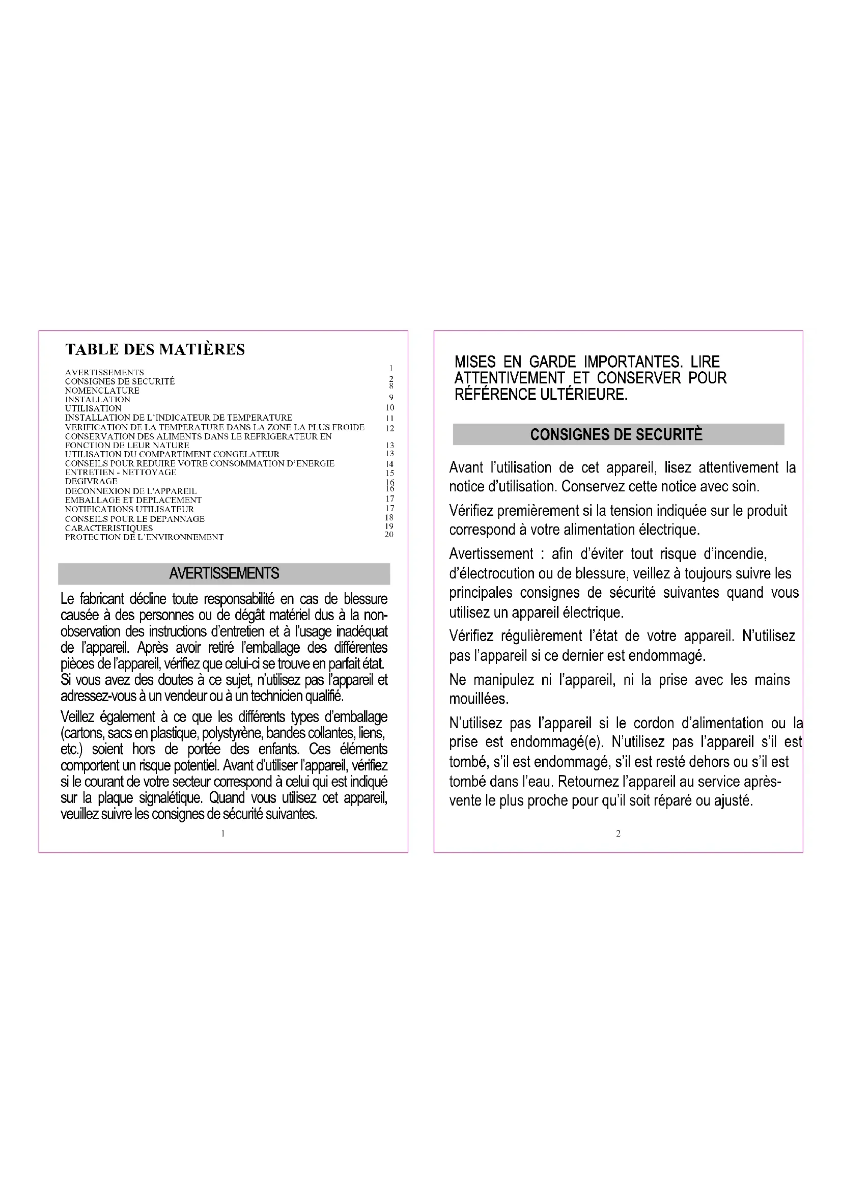 MISE EN GARDE: ne pas utiliser de dispositifs mécaniques ou autres moyens pour accélérer le processus de dégivrage autres que ceux recommendés par le fabricant.