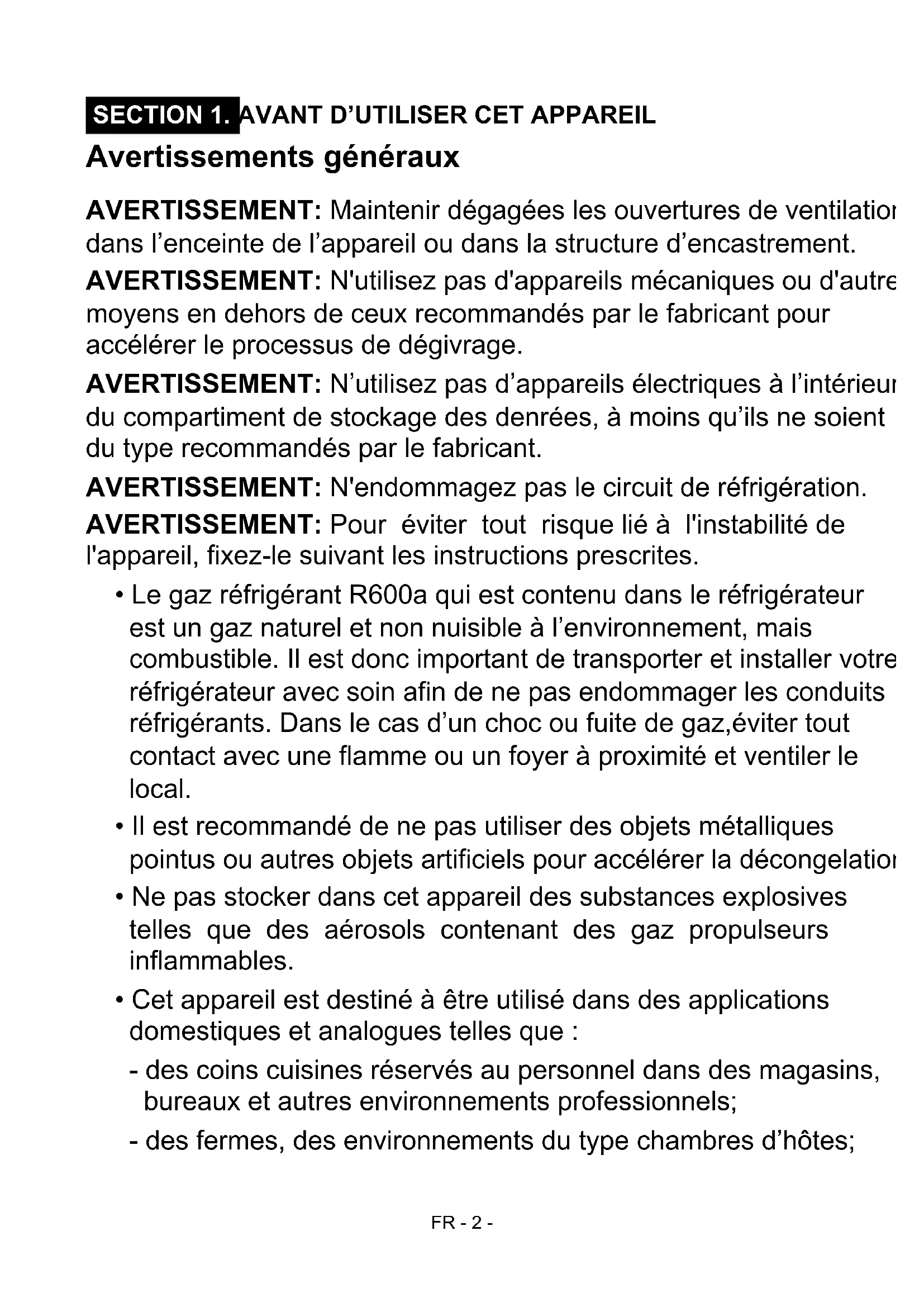 - Le gaz réfrigérant R600a qui est contenu dans le réfrigérateur est un gaz naturel et non nuisible à l’environnement, mais combustible. Il est donc important de transporter et installer votre réfrigérateur avec soin afin de ne pas endommager les conduits réfrigérants. Dans le cas d’un choc ou fuite de gaz,éviter tout contact avec une flamme ou un foyer à proximité et ventiler le local.