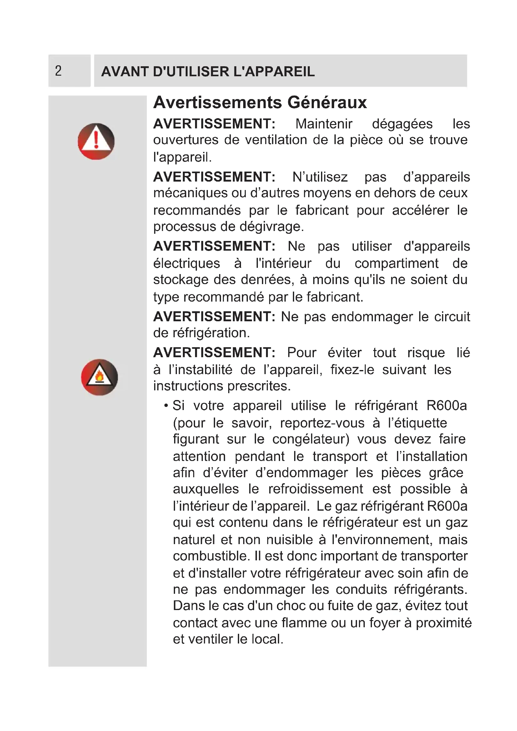 Si vous appareil utilise le réfrigérant R600a (pour le savoir, reportez-vous à l'étiquette figurant sur le congélateur) vous devez faire attention pendant le transport et l'installation afin d'éviter d'endommager les pieces grâce auxquelles le refroidissement est possible à l'intérieur de l'appareil. Le gaz réfrigérant R600a qui est contenu dans le réfrigérateur est un gaz naturel et non nuisible à l'environnement, mais combustible. Il est donc important de transporter et dinstaller votre réfrigérateur avec soin afin de ne pas endommager les conduits réfrigérants. Dans le cas d'un choc ou fuite de gaz, évitez tout contact avec une flamme ou un foyer à proximité et ventiler le local.