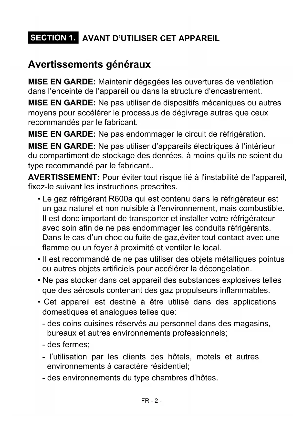 - Le gaz réfrigérant R600a qui est contenu dans le réfrigérateur est un gaz naturel et non nuisible à l'environnement, mais combustible. Il est donc important de transporter et installer votre réfrigérateur avec soin afin de ne pas endommager les conduits réfrigerants. Dans le cas d'un choc ou fuite de gaz, éviter tout contact avec une flamme ou un foyer à proximité et ventiler le local.