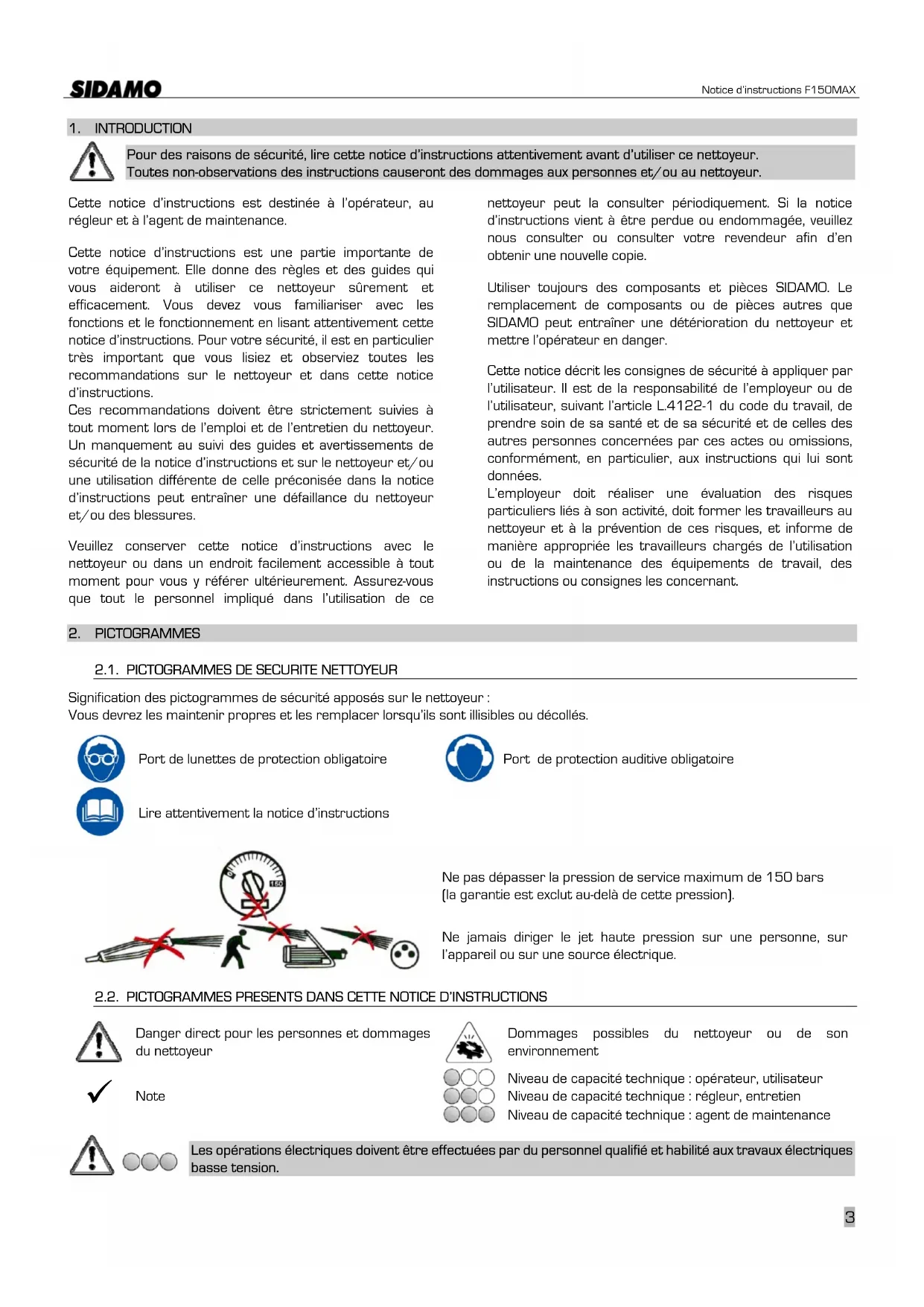 F 150 MAX - Nettoyeur haute pressio Sidamo - Notice d'utilisation et mode d'emploi gratuit