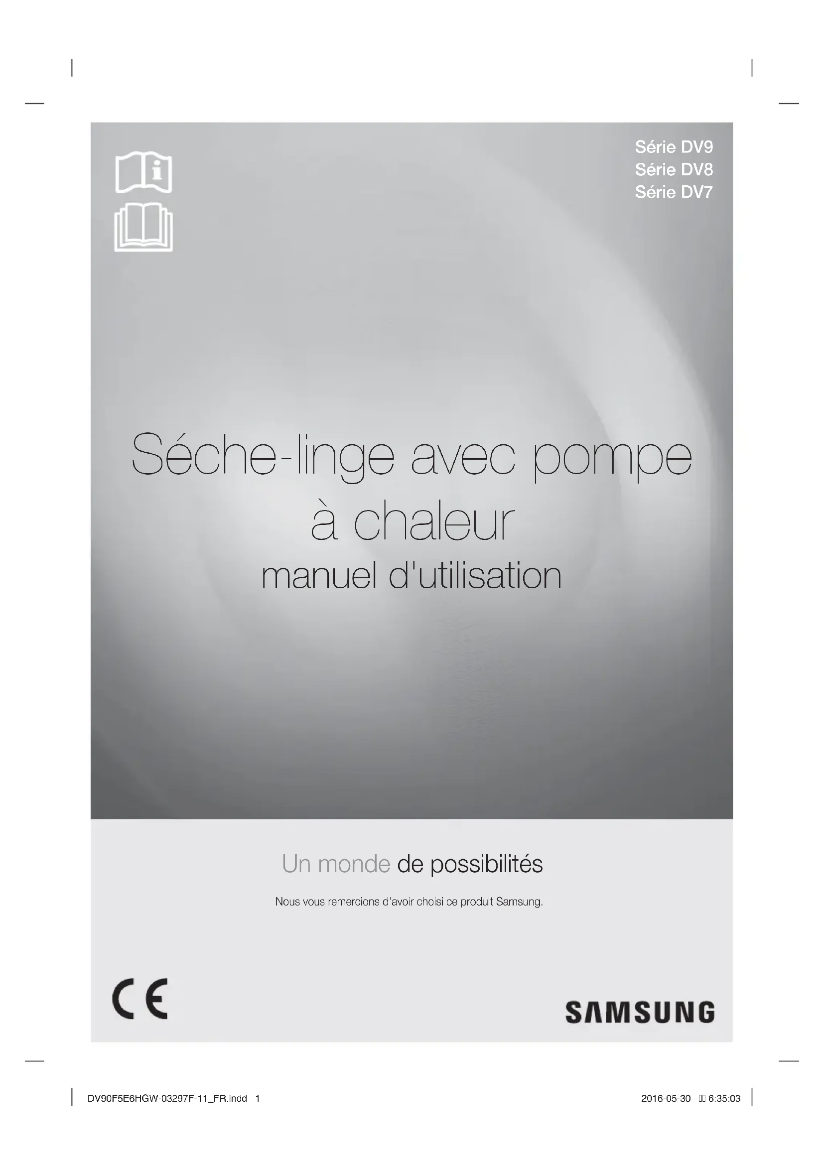 UNTER SWITZERLAND 0800 726 78 64 (0800-SAMSUNG) www.samsung.com/ch/support (German) www.samsung.com/ch_fr/support (French) DC68-03297F-11 DV90F5E6HGW-03297F-11_DE.indd Sec4:36DV90F5E6HGW-03297F-11_DE.indd Sec4:36 2016-05-30 6:34:392016-05-30 6:34:39Séche-linge avec pompe à chaleur manuel d'utilisation Un monde de possibilités Nous vous remercions d'avoir choisi ce produit Samsung. Série DV9 Série DV8 Série DV7 DV90F5E6HGW-03297F-11_FR.indd 1DV90F5E6HGW-03297F-11_FR.indd 1 2016-05-30 6:35:032016-05-30 6:35:03Français - 2 table des matières