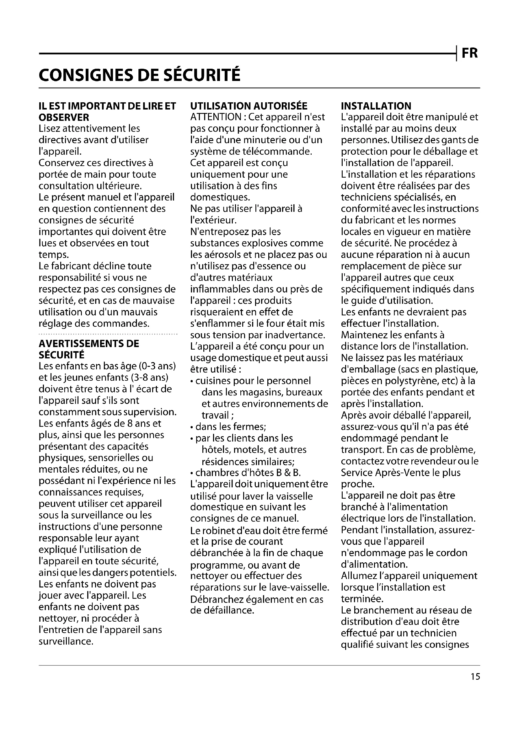 - chambres d'hôtes B & B. L'appareil doit uniquement être utilisé pour laver la vaisselle domestique en suivant les consignes de ce manuel. Le robinet d'eau doit être fermé et la prise de courant débranchée à la fin de chaque programme, ou avant de nettoyer ou effectuer des réparations sur le lave-vaisselle. Débranchez également en cas de défaillance. INSTALLATION L'appareil doit être manipulé et installé par au moins deux personnes. Utilisez des gants de protection pour le déballage et l'installation de l'appareil. L'installation et les réparations doivent être réalisées par des techniciens spécialisés, en conformité avec les instructions du fabricant et les normes locales en vigueur en matière de sécurité. Ne procédez à aucune réparation ni à aucun remplacement de pièce sur l'appareil autres que ceux spécifiquement indiqués dans le guide d'utilisation. Les enfants ne devraient pas effectuer l'installation. Maintenez les enfants à distance lors de l'installation. Ne laissez pas les matériaux d'emballage (sacs en plastique, pièces en polystyrène, etc) à la portée des enfants pendant et après l'installation. Après avoir déballé l'appareil, assurez-vous qu'il n'a pas été endommagé pendant le transport. En cas de problème, contactez votre revendeur ou le Service Après-Vente le plus proche. L'appareil ne doit pas être branché à l'alimentation électrique lors de l'installation. Pendant l'installation, assurez- vous que l'appareil n'endommage pas le cordon d'alimentation. Allumez l’appareil uniquement lorsque l’installation est terminée. Le branchement au réseau de distribution d'eau doit être effectué par un technicien qualifié suivant les consignes FR16 du fabricant et conformément aux réglementations locales en vigueur en matière de sécurité. L'appareil doit être branché à la conduite principale en utilisant de nouveaux tuyaux. Évitez de réutiliser des tuyaux usagés. Un collier doit être fermement fixé sur tous les tuyaux afin que ces derniers ne se desserrent pas lors du fonctionnement de l'appareil. Respectez les normes en vigueur de la société locale de distribution d'eau. Pression d'alimentation en eau : 0,05 - 1,0 MPa. La température d'entrée d'eau dépend du modèle du lave- vaisselle. Si le tuyau d'alimentation indique « max 25°C », la température maximum de l'eau ne doit pas dépasser 25°C. Pour tous les autres modèles, la température de l'eau permise est de 60°C. Ne coupez pas les flexibles et, en présence d'un appareil avec système de coupure de l'arrivée d'eau, ne plongez pas dans l'eau le boîtier en plastique de raccordement au réseau hydrique. Si les tuyaux sont trop courts, adressez-vous à votre revendeur. Assurez-vous que les tuyaux d'alimentation et de vidange ne sont ni pliés ni tordus. Avant toute utilisation, vérifiez l'étanchéité des tuyaux d' alimentation et de vidange de l'eau. Pendant l'utilisation, l'accès au mur arrière doit être limité, notamment en approchant le plus possible l'appareil du mur ou du meuble. Lors de l'installation de l'appareil, assurez-vous que les quatre supports sont stables et reposent sur le sol, en les ajustant au besoin, et assurez- vous que l'appareil est parfaitement de niveau en utilisant un niveau à bulle. Si l'appareil est installé à l'extrémité d'une rangée d'unités et que sa paroi latérale est exposée, protégez les charnières pour éviter qu'elle ne soit endommagée. Pour les lave-vaisselles avec des ouvertures à la base pour la ventilation, les ouvertures ne doivent pas être bloquées par un tapis. AVERTISSEMENTS ÉLECTRIQUES Pour que l'installation soit conforme à la réglementation en vigueur en matière de sécurité, un interrupteur omnipolaire avec un intervalle de contact minimum de 3 mm est requis, et la mise à la terre de l'appareil est obligatoire. Si le câble d'alimentation est endommagé, remplacez-le avec un câble identique. Le câble électrique ne doit être remplacé que par un technicien qualifié conformément aux directives du fabricant et aux normes de sécurité en vigueur. Adressez-vous à un Service Après-vente agréé. Si la fiche installée n'est pas adaptée pour votre prise, contactez un technicien qualifié. Une fois l'appareil installé dans son meuble, le câble d'alimentation doit être suffisamment long pour le brancher à l'alimentation électrique principale. Ne tirez pas sur le câble d'alimentation. N'utilisez pas de rallonge, de multiprise, ou d'adaptateurs. N'utilisez en aucun cas cet appareil si le cordon d'alimentation ou la prise de courant est endommagé, si l'appareil ne fonctionne pas correctement ou s'il a été endommagé ou est tombé. Éloignez le cordon des surfaces chaudes. Une fois l'installation terminée, l'utilisateur ne doit plus pouvoir accéder aux composantes électriques. Évitez de toucher l'appareil si vous êtes mouillé, et ne l'utilisez pas si vous êtes pieds nus. UTILISATION CORRECTE L'eau du lave-vaisselle n'est pas potable. Le nombre maximum de places est indiqué sur la fiche produit. La porte de devrait pas être laissée ouverte; vous pourriez trébucher dessus. La porte ouverte ne peut porter que le panier à vaisselle (chargé de vaisselle). N'appuyez pas d'objet sur la porte, ne vous asseyez pas et ne montez pas dessus. Utilisez uniquement des détergents et des produits de rinçage conçus pour un lave- vaisselle automatique.