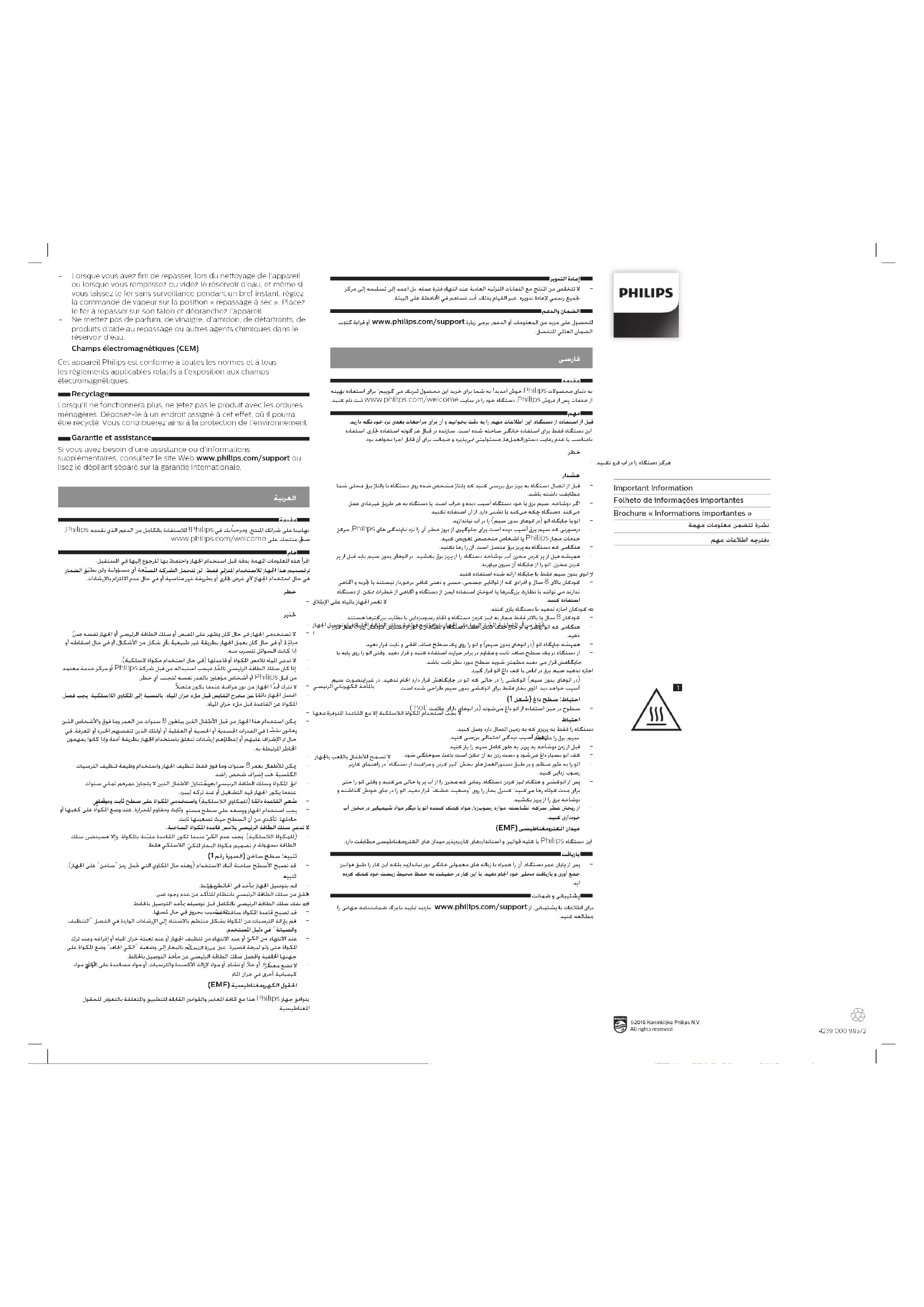- Lorsque vous avez ni de repasser, lors du nettoyage de l‘appareil ou lorsque vous remplissez ou videz le réservoir d‘eau, et même si vous laissez le fer sans surveillance pendant un bref instant, réglez la commande de vapeur sur la position « repassage à sec ». Placez le fer à repasser sur son talon et débranchez l‘appareil. - Ne mettez pas de parfum, de vinaigre, d‘amidon, de détartrants, de produits d‘aide au repassage ou autres agents chimiques dans le réservoir d‘eau. Champs électromagnétiques )CEM( Cet appareil Philips est conforme à toutes les normes et à tous les règlements applicables relatifs à l‘exposition aux champs électromagnétiques. Recyclage Lorsqu‘il ne fonctionnera plus, ne jetez pas le produit avec les ordures ménagères. Déposez-le à un endroit assigné à cet effet, où il pourra être recyclé. Vous contribuerez ainsi à la protection de l‘environnement. Garantie et assistance Si vous avez besoin d‘une assistance ou d‘informations supplémentaires, consultez le site Web www.philips.com/support ou lisez le dépliant séparé sur la garantie internationale.