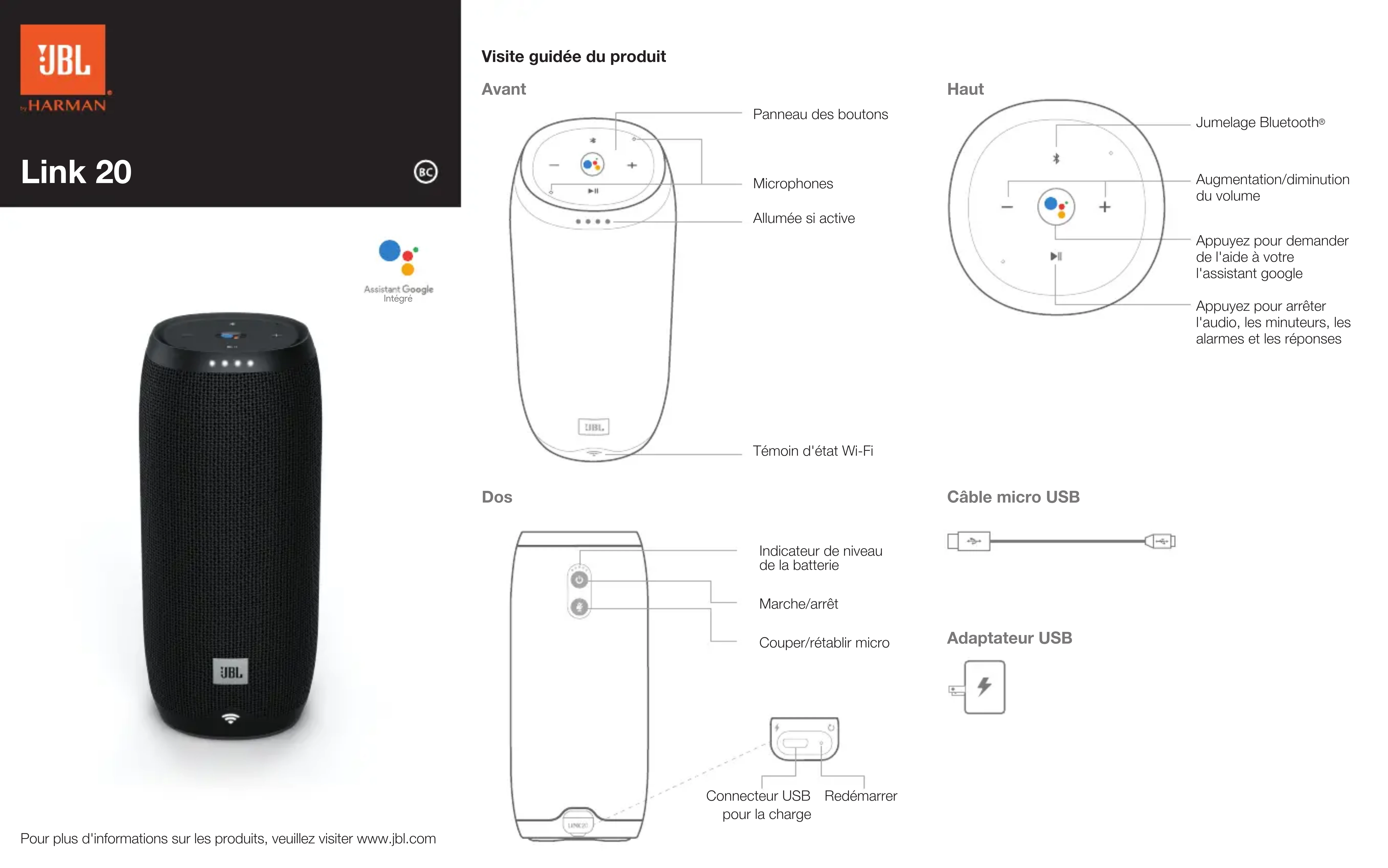 Augmentation/diminution du volume Appuyez pour demander de l'aide à votre l'assistant google Appuyez pour arrêter l'audio, les minuteurs, les alarmes et les réponses Visite guidée du produit Adaptateur USB Câble micro USB Témoin d'état Wi-Fi Panneau des boutons Allumée si active Microphones Pour plus d'informations sur les produits, veuillez visiter www.jbl.com IntégréTR04487_D