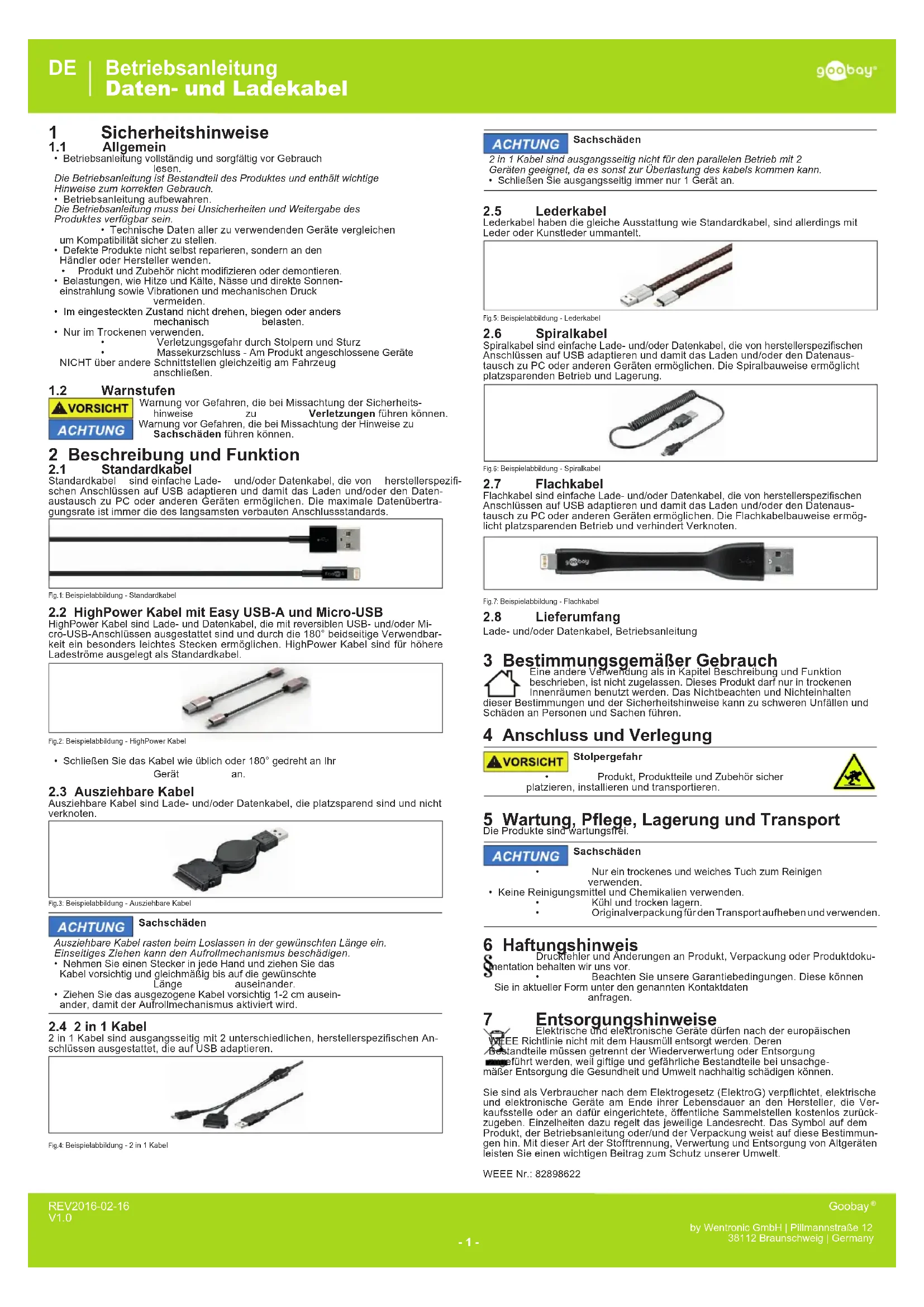 - 3 -Goobay by Wentronic GmbH | Pillmannstraße 12 38112 Braunschweig | GermanyREV2016-02-16 V1.0 1 Consignes de sécurité 1.1 En général • Lisez le présent mode d‘emploi en entier et avec attention. Le mode d‘emploi fait partie intégrante du produit et comprend d‘importantes informations pour une bonne installation et une bonne utilisation. • Conservez soigneusement ce mode d‘emploi. Le mode d‘emploi doit être disponible à des incertitudes et transfert du produit. • Comparer les caractéristiques de tous les équipements à utiliser et assurer la compatibilité. • Ne pas réparer les produits défectueux par vous-même, mais contactez le revendeur ou le producteur. • Nepasmodieroualtérerleproduitniaccessoires. • Éviter des conditions extrêmes, telles que la chaleur extrême et froid, l‘humidité et de la lumière directe du soleil, ainsi que microondes, des vibrations et de la pression mécanique. • Ne pas tourner à l‘état inséré. • Utiliser uniquement dans une ambiance sèche. • Risque de blessure en cas de trébucher et la tombe • Court-circuit à la terre - Ne pas connecter des périphériques déjà connectés à d‘autres interfaces du véhicule simultanément.1.3 Niveaux de mises en garde Mises en garde contre les dangers pouvant entraîner des blessures en cas de non respect. Mises en garde contre les dangers pouvant entraîner les dommages matériels en. 2 Description et fonctions 2.1 Câbles standardCâbles standard sont des câbles de charge et / ou de données faciles qui adaptent desconnexionsspéciquesaufabricantsurUSBetainsipermettrelechargementet / ou l‘échange de données à un PC ou d‘autres appareils. Le taux de transfert de données maximum est toujours le plus lent des normes de connexion installés. Fi g. 15 : Figure échantillon - Câbles standard 2.2 Câble à haute puissance avec Easy USB-A et Micro-USBCâbles haute puissance sont en charge et les câbles de données, viennent avec des ports micro-USB ou USB réversible et / ou et permettent l‘utilisation à 180° des deux côtés notamment une insertion facile. Câbles haute puissance sont conçus pour des courants de charge plus élevés que les câbles standard.Fig . 16: Figure échantillon - Câbles haute puissance • Branchez le câble en degrés habituels ou 180 avec votre appareil.2.3 Câbles extensiblescâbles extensibles sont en charge des câbles et / ou de données qui sont compacts et ne lient pas. Fi g . 17: Figure échantillon - Câbles extensibles Les dommages matériels Câble extensibles verrouiller ensemble lorsqu‘il est libéré dans la longueur désirée. Tirant verso peut endommager le mécanisme d‘enroulement. • Prenez un bouchon dans chaque main et tirez doucement et régulièrement le câble à la longueur désirée de l‘autre. • Débranchez le câble étendu doucement 1-2 cm de distance, de sorte que le mécanisme d‘enroulement est activé. 2.4 Câbles 2 en 1Câbles2en1disposentde2connecteursdifférents,spéciquesaufournisseurdeleur côté de sortie et de les adapter à l‘USB. Fig . 18: Figure échantillon - Câbles 2 en 1 Material damage Câbles 2 en 1 ne sont pas faites pour fonctionner en parallèle avec 2 dis- positifs sur leurs sorties, car il peut surcharger le câble autrement. • Connectez seulement 1 appareil sur le côté de sortie. 2.5 Câbles en cuirCâbles en cuir ont les mêmes facilités que câble standard, mais sont recouverts de cuir ou cuir synthétique.Fig. 19: Figure échantillon - Câbles en cuir2.6 Câbles spiraleCâbles spirale sont de simples câbles de charge et / ou de données qui adaptent connecteursspéciquesaufabricantàl‘USBetdoncpermettentdechargeret/oud‘échanger des données vers un PC ou d‘autres appareils. La conception en spirale permet un fonctionnement et un gain de place.Fig. 20: Figure échantillon - Câbles spirale2.7 Câbles platsCâbles plats sont simples câbles de charge et / ou de données qui adaptent connecteursspéciquesaufabricantàUSBetdoncpermettentdechargeret/ou échanger des données à un PC ou d‘autres appareils. La conception du câble plat permet un fonctionnement à faible encombrement et à prévenir nouage. Fi g . 21: Figure échantillon - Câbles plats