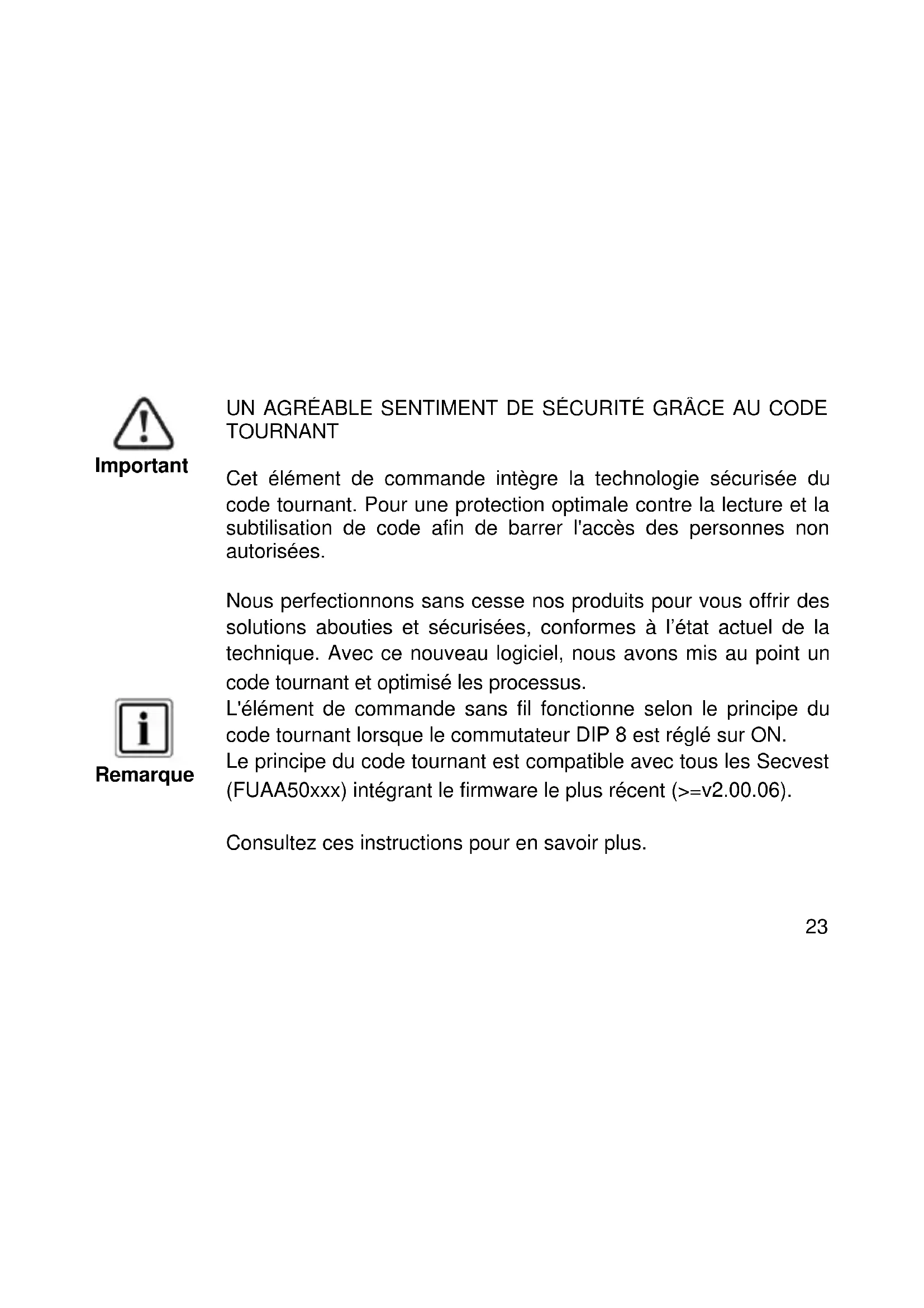 L'élément de commande sans fil fonctionne selon le principe du code tournant lorsque le commutateur DIP 8 est réglé sur ON. Le principe du code tournant est compatible avec tous les Secvest (FUAA50xxx) intégrant le firmware le plus récent (>= v2.00.06).