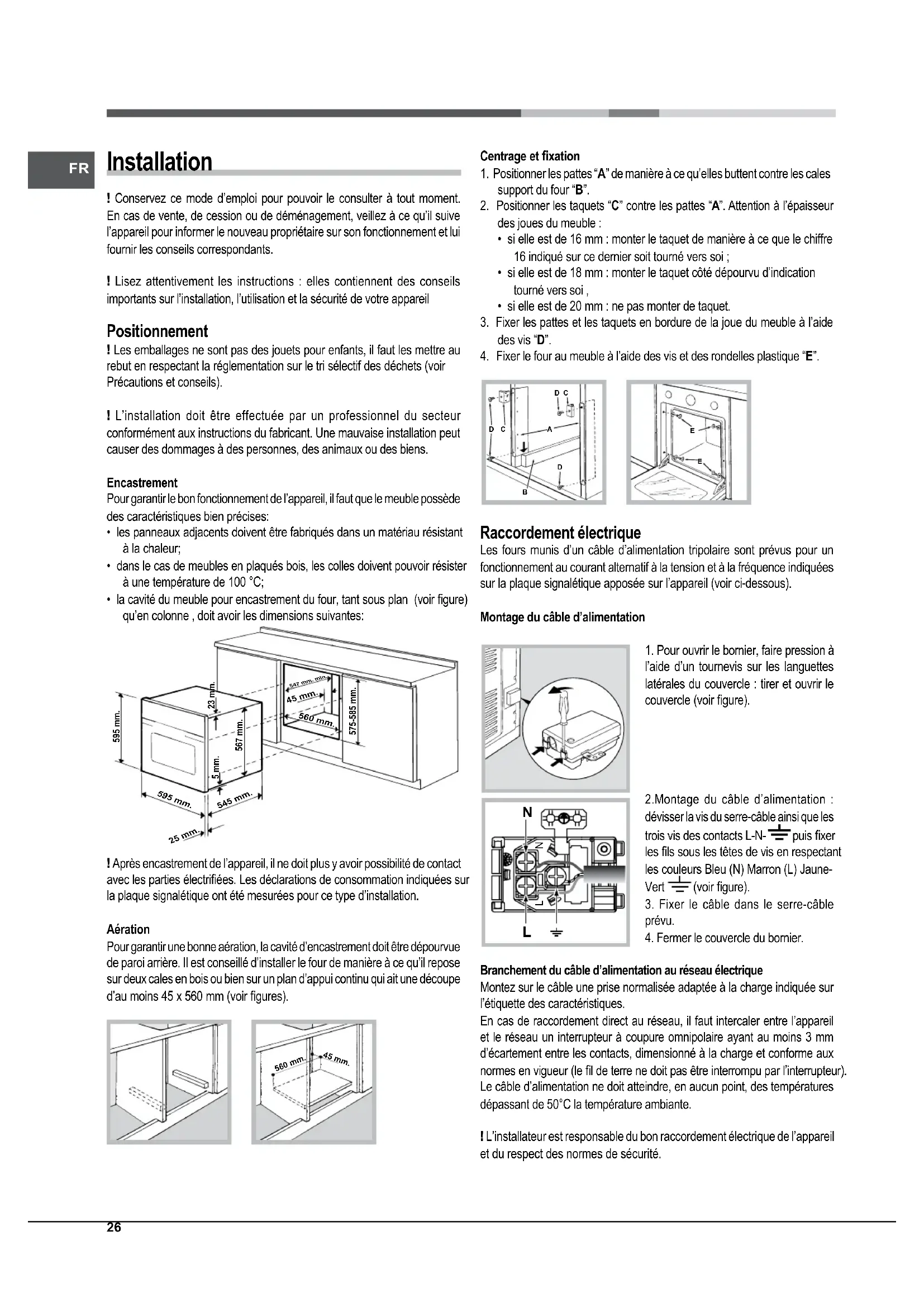 Installation ! Conservez ce mode d’emploi pour pouvoir le consulter à tout moment. En cas de vente, de cession ou de déménagement, veillez à ce qu’il suive l’appareil pour informer le nouveau propriétaire sur son fonctionnement et lui fournir les conseils correspondants.! Lisez attentivement les instructions : elles contiennent des conseils importants sur l’installation, l’utilisation et la sécurité de votre appareil Positionnement ! Les emballages ne sont pas des jouets pour enfants, il faut les mettre au rebut en respectant la réglementation sur le tri sélectif des déchets (voir Précautions et conseils).! L’installation doit être effectuée par un professionnel du secteur conformément aux instructions du fabricant. Une mauvaise installation peut causer des dommages à des personnes, des animaux ou des biens.EncastrementPour garantir le bon fonctionnement de l’appareil, il faut que le meuble possède des caractéristiques bien précises:• les panneaux adjacents doivent être fabriqués dans un matériau résistant à la chaleur;• dans le cas de meubles en plaqués bois, les colles doivent pouvoir résister à une température de 100 °C;• la cavité du meuble pour encastrement du four, tant sous plan (voir gure) qu’en colonne , doit avoir les dimensions suivantes: 595 mm.595 mm.25 mm.545 mm.5 mm.567 mm.23 mm.575-585 mm.45 mm.560 mm. 547 mm. min. ! Après encastrement de l’appareil, il ne doit plus y avoir possibilité de contact avec les parties électriées. Les déclarations de consommation indiquées sur la plaque signalétique ont été mesurées pour ce type d’installation.AérationPour garantir une bonne aération, la cavité d’encastrement doit être dépourvue de paroi arrière. Il est conseillé d’installer le four de manière à ce qu’il repose sur deux cales en bois ou bien sur un plan d’appui continu qui ait une découpe d’au moins 45 x 560 mm (voir gures). 560 mm. 45 mm. Centrage et xation1. Positionner les pattes “A” de manière à ce qu’elles buttent contre les cales support du four “B”.