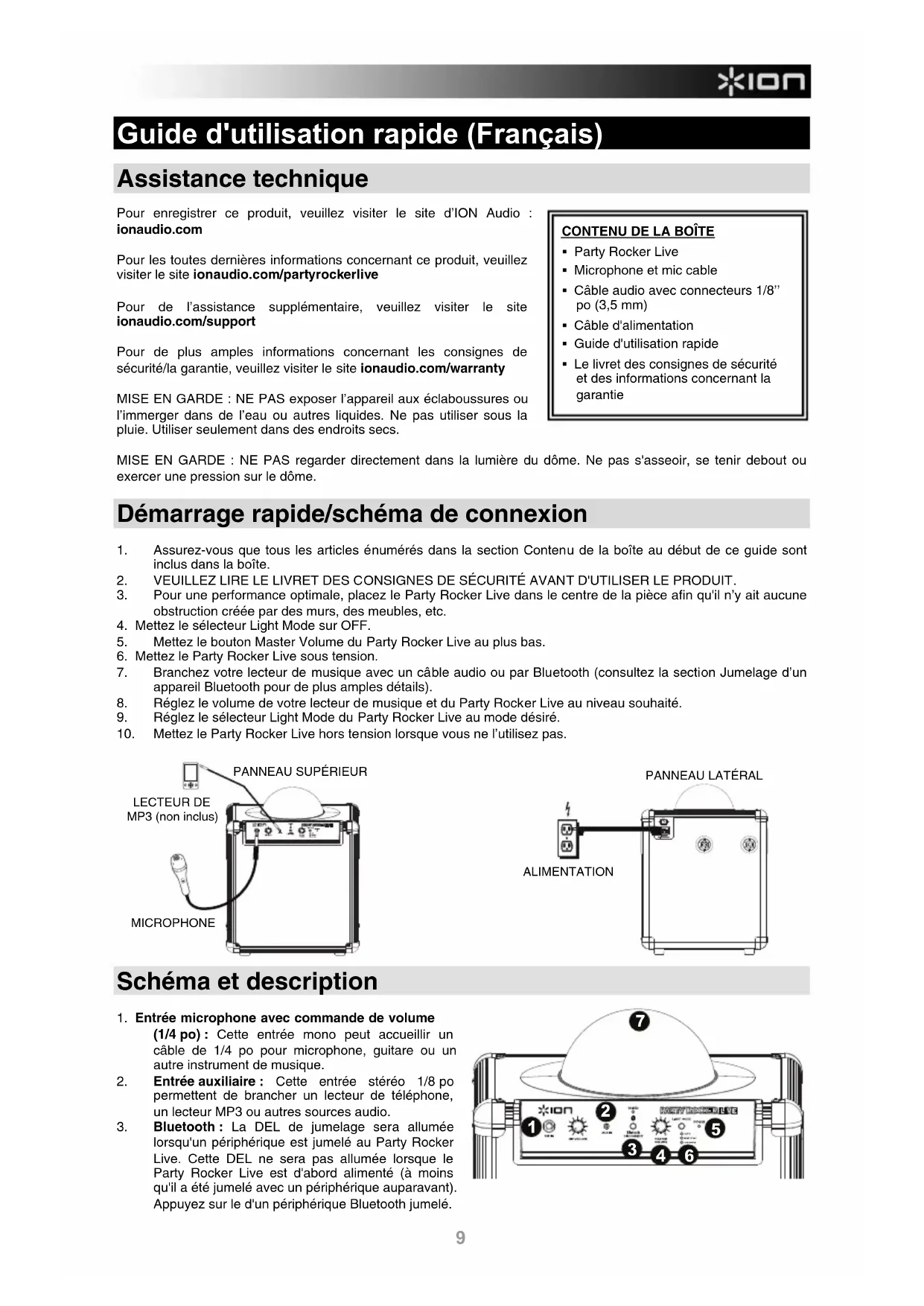 - Modo sincronización de ritmo o modo automático9 Guide d'utilisation rapide (Français) Assistance technique Pour enregistrer ce produit, veuillez visiter le site d’ION Audio : ionaudio.com Pour les toutes dernières informations concernant ce produit, veuillez visiter le site ionaudio.com/partyrockerlive Pour de l’assistance supplémentaire, veuillez visiter le site ionaudio.com/support Pour de plus amples informations concernant les consignes de sécurité/la garantie, veuillez visiter le site ionaudio.com/warranty MISE EN GARDE : NE PAS exposer l’appareil aux éclaboussures ou l’immerger dans de l’eau ou autres liquides. Ne pas utiliser sous la pluie. Utiliser seulement dans des endroits secs. MISE EN GARDE : NE PAS regarder directement dans la lumière du dôme. Ne pas s'asseoir, se tenir debout ou exercer une pression sur le dôme. Démarrage rapide/schéma de connexion