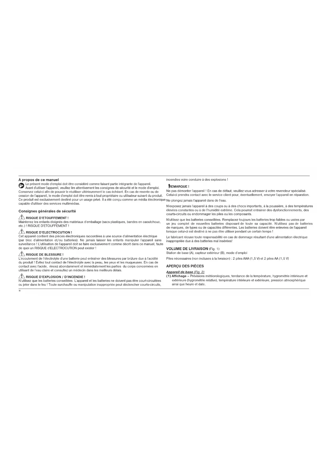 Garantie / Warranty16 A propos de ce manuel Le présent mode d‘emploi doit être considéré comme faisant partie intégrante de l’appareil. Avant d’utiliser l’appareil, veuillez lire attentivement les consignes de sécurité et le mode d’emploi. Conservez celui-ci afin de pouvoir le réutiliser ultérieurement le cas échéant. En cas de revente ou de cession de l’appareil, le mode d’emploi doit être remis à tout propriétaire ou utilisateur suivant du produit. Ce produit est exclusivement destiné pour un usage privé. Il a été conçu comme un média électronique capable d’utiliser des services multimédias. Consignes générales de sécurité RISQUE D’ETOUFFEMENT ! Maintenez les enfants éloignés des matériaux d’emballage (sacs plastiques, bandes en caoutchouc, etc.) ! RISQUE D’ETOUFFEMENT ! RISQUE D’ELECTROCUTION ! Cet appareil contient des pièces électroniques raccordées à une source d’alimentation électrique (par bloc d’alimentation et/ou batteries). Ne jamais laisser les enfants manipuler l’appareil sans surveillance ! L’utilisation de l’appareil doit se faire exclusivement comme décrit dans ce manuel, faute de quoi un RISQUE d’ELECTROCUTION peut exister ! RISQUE DE BLESSURE ! L’écoulement de l‘électrolyte d’une batterie peut entraîner des blessures par brûlure due à l’acidité du produit ! Evitez tout contact de l’électrolyte avec la peau, les yeux et les muqueuses. En cas de contact avec l‘acide, rincez abondamment et immédiatement les parties du corps concernées en utilisant de l’eau claire et consultez un médecin dans les meilleurs délais. RISQUE D’EXPLOSION / D’INCENDIE ! N’utilisez que les batteries conseillées. L’appareil et les batteries ne doivent pas être court-circuitées ou jeter dans le feu ! Toute surchauffe ou manipulation inappropriée peut déclencher courts-circuits, incendies voire conduire à des explosions ! REMARQUE ! Ne pas démonter l’appareil ! En cas de défaut, veuillez vous adresser à votre revendeur spécialisé. Celui-ci prendra contact avec le service client pour, éventuellement, envoyer l’appareil en réparation. Ne plongez jamais l’appareil dans de l’eau. N’exposez jamais l’appareil à des coups ou à des chocs importants, à la poussière, à des températures élevées constantes ou à de l’humidité extrême. Cela pourrait entrainer des dysfonctionnements, des courts-circuits ou endommager les piles ou les composants. N‘utilisez que les batteries conseillées. Remplacez toujours les batteries trop faibles ou usées par un jeu complet de nouvelles batteries disposant de toute sa capacité. N’utilisez pas de batteries de marques, de types ou de capacités différentes. Les batteries doivent être enlevées de l’appareil lorsque celui-ci est destiné à ne pas être utiliser pendant un certain temps ! Le fabricant récuse toute responsabilité en cas de dommage résultant d’une alimentation électrique inappropriée due à des batteries mal insérées! VOLUME DE LIVRAISON (Fig. 1) Station de base (A), capteur extérieur (B), mode d’emploi Piles nécessaires (non incluses à la livraison) : 2 piles AAA (1,5 V) et 2 piles AA (1,5 V)