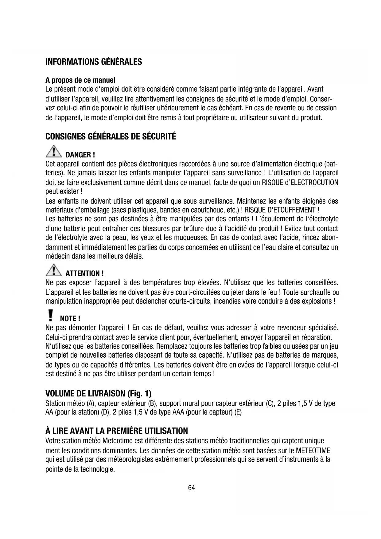 A propos de ce manuel Le présent mode d‘emploi doit être considéré comme faisant partie intégrante de l’appareil. Avant d’utiliser l’appareil, veuillez lire attentivement les consignes de sécurité et le mode d’emploi. Conser- vez celui-ci afin de pouvoir le réutiliser ultérieurement le cas échéant. En cas de revente ou de cession de l’appareil, le mode d’emploi doit être remis à tout propriétaire ou utilisateur suivant du produit. CONSIGNES GÉNÉRALES DE SÉCURITÉ DANGER ! Cet appareil contient des pièces électroniques raccordées à une source d’alimentation électrique (bat- teries). Ne jamais laisser les enfants manipuler l’appareil sans surveillance ! L’utilisation de l’appareil doit se faire exclusivement comme décrit dans ce manuel, faute de quoi un RISQUE d’ELECTROCUTION peut exister ! Les enfants ne doivent utiliser cet appareil que sous surveillance. Maintenez les enfants éloignés des matériaux d’emballage (sacs plastiques, bandes en caoutchouc, etc.) ! RISQUE D’ETOUFFEMENT ! Les batteries ne sont pas destinées à être manipulées par des enfants ! L’écoulement de l‘électrolyte d’une batterie peut entraîner des blessures par brûlure due à l’acidité du produit ! Evitez tout contact de l’électrolyte avec la peau, les yeux et les muqueuses. En cas de contact avec l‘acide, rincez abon- damment et immédiatement les parties du corps concernées en utilisant de l’eau claire et consultez un médecin dans les meilleurs délais. ATTENTION ! Ne pas exposer l’appareil à des températures trop élevées. N’utilisez que les batteries conseillées. L’appareil et les batteries ne doivent pas être court-circuitées ou jeter dans le feu ! Toute surchauffe ou manipulation inappropriée peut déclencher courts-circuits, incendies voire conduire à des explosions ! NOTE ! Ne pas démonter l’appareil ! En cas de défaut, veuillez vous adresser à votre revendeur spécialisé. Celui-ci prendra contact avec le service client pour, éventuellement, envoyer l’appareil en réparation. N‘utilisez que les batteries conseillées. Remplacez toujours les batteries trop faibles ou usées par un jeu complet de nouvelles batteries disposant de toute sa capacité. N’utilisez pas de batteries de marques, de types ou de capacités différentes. Les batteries doivent être enlevées de l’appareil lorsque celui-ci est destiné à ne pas être utiliser pendant un certain temps ! VOLUME DE LIVRAISON (Fig. 1) Station météo (A), capteur extérieur (B), support mural pour capteur extérieur (C), 2 piles 1,5 V de type AA (pour la station) (D), 2 piles 1,5 V de type AAA (pour le capteur) (E)