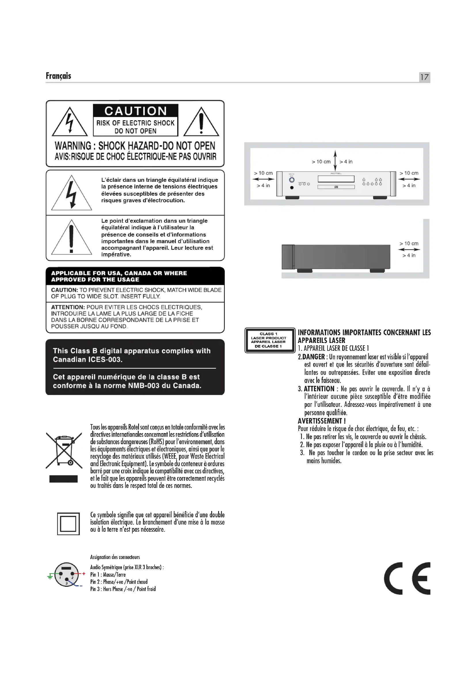Assignation des connecteurs Audio Symétrique (prise XLR 3 broches) : Pin 1 : Masse/Terre Pin 2 : Phase/+ve /Point chaud Pin 3 : Hors Phase /-ve / Point froid CLASS 1 LASER PRODUCT APPAREIL LASER DE CLASSE 118 RCD-1572 Lecteur de disques compacts stéréo L’appareil doit être installé de manière que sa ventilation interne puisse fonctionner correctement, c’est-à-dire avec un espace libre d’une dizaine de centimètres minimum autour de lui. ATTENTION : La prise d’alimentation située à l’arrière constitue le principal moyen pour déconnecter l’appareil du secteur. Cet équipement doit être positionné dans un espace ouvert qui permet de garder l‘accès au câble d’alimentation. Cet appareil doit être branché sur une prise d’alimentation secteur, d’une tension et d’un type conformes à ceux qui sont indiqués sur la face arrière de l’appareil. (USA : 120 V/60 Hz, CE : 230 V/50 Hz) Brancher l’appareil uniquement grâce au cordon secteur fourni, ou à un modèle équivalent. Ne pas tenter de modifier ou changer la prise. Ne pas utiliser de cordon rallonge. La prise d’alimentation secteur constitue le moyen radical de déconnexion de l’appareil. Elle doit donc rester en permanence accessible, car sa déconnexion constitue la seule assurance que l’appareil n’est plus alimenté par le secteur. Les piles de la télécommande ne doivent pas être exposées à une température excessive, comme l’exposition directe au soleil, au feu ou équivalent. Information FCC Cet appareil a été testé afin de vérifier sa conformité avec les normes minima des appareils numériques de Classe B, suivant l’article 15 des normes FCC. Ces normes garantissent une protection suffisante contre les interférences, dans le cadre d’une utilisation domestique. Cet appareil génère, utilise et peut rayonner des fréquences radio et peut, s’il n’est pas utilisé selon les conseils prodigués dans ce manuel d’utilisation, causer des interférences avec les communications radio. Il n’y a cependant aucune garantie que ces interférences puissent apparaître dans certaines configurations. Si vous notez la présence de parasites sur la radio ou la télévision (détectées par la mise sous et hors tension de l’appareil), vous pouvez essayer d’éliminer ces interférences en essayant l’une des procédures suivantes :