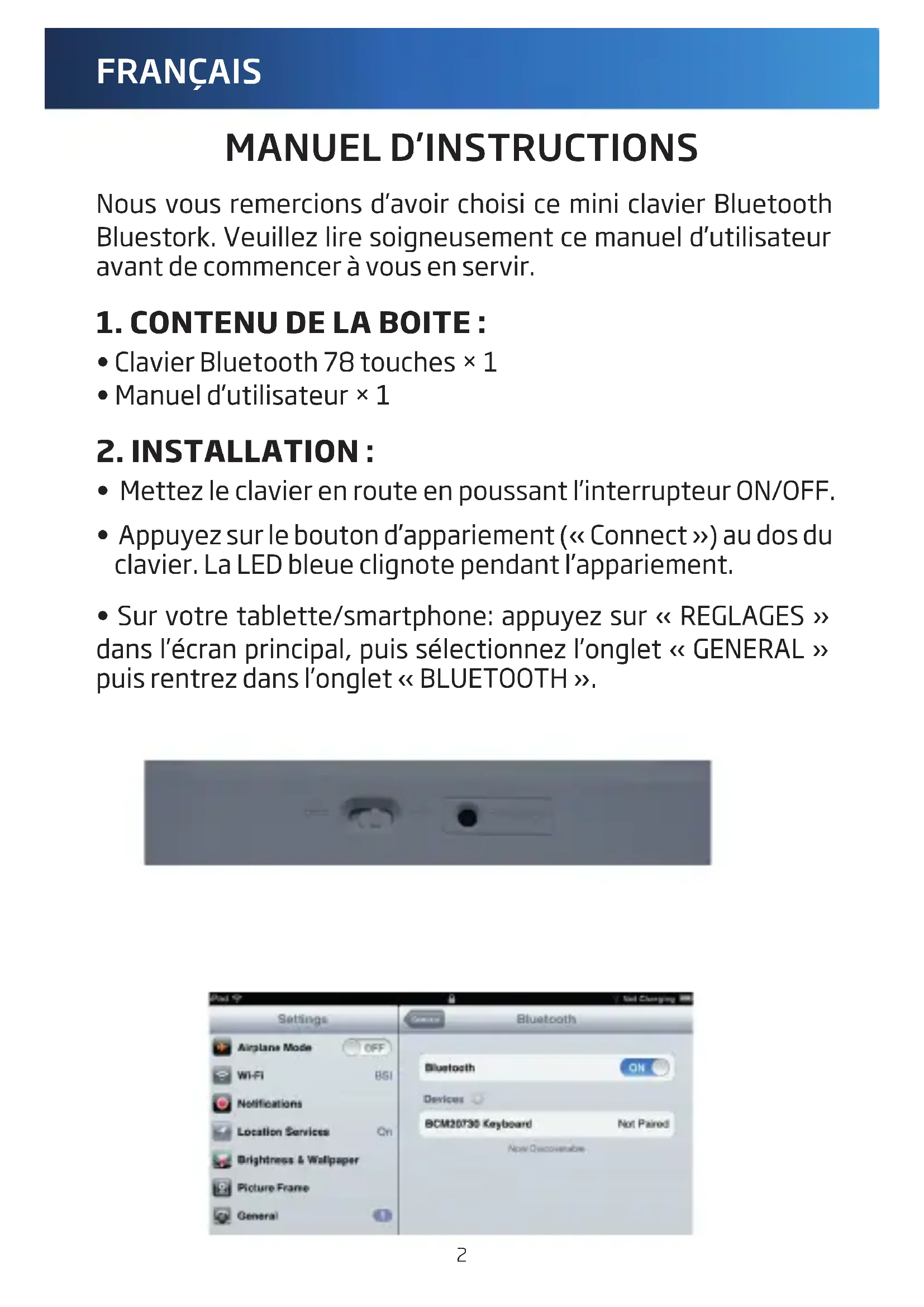 Nous vous remercions d'avoir besoin ce mini clavier Bluetooth Bluestork. Veuillez lore soigneusement ce manuel d'utilisateur avant de commencer à vous en servir.