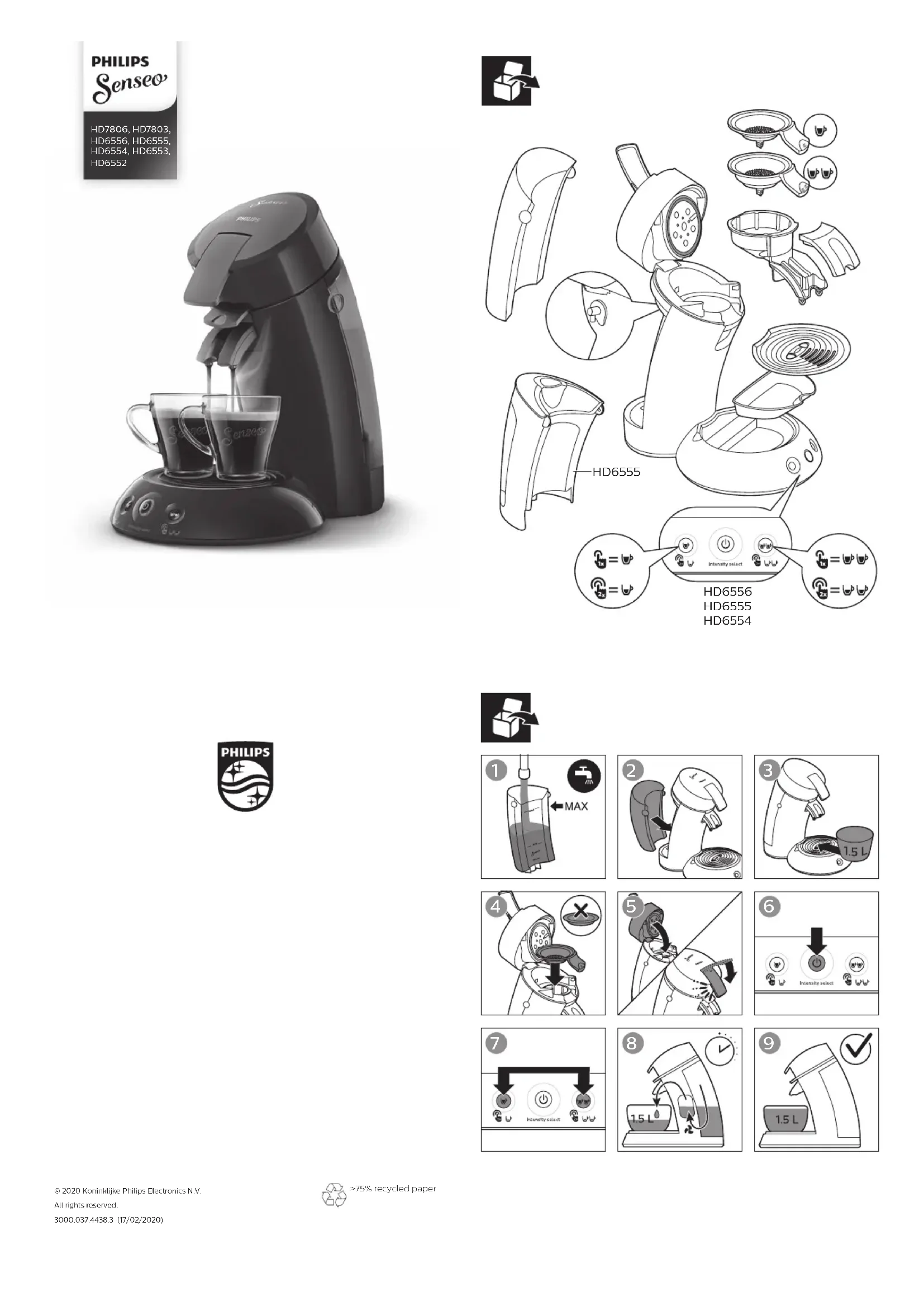 ntroduction Félicitations pour votre achat et bienvenue dans l’univers Philips ! Pour proter pleinement des avantages de l’assistance Philips, enregistrez votre produit à l’adresse www.philips.com/welcome. Cette nouvelle machine SENSEO® (HD6554, HD6555, HD6556) ore plus de choix grâce à la sélection de l‘intensité. Outre un café SENSEO® allongé et doux, vous pouvez aussi préparer un café SENSEO® plus petit et corsé en appuyant simplement deux fois sur le bouton. Eau froide claire Utilisez chaque jour une eau froide et claire. Si vous n‘avez pas utilisé la machine à café pendant 1 jour, rincez-la à l‘eau claire et froide avant de la réutiliser. Pour rincer la machine à café, remplissez le réservoir d’eau froide claire, placez un bol ou deux tasses sous le bec verseur et appuyez sur le bouton pour deux tasses à plusieurs reprises pour laisser l’eau chaude s’écouler jusqu’à ce que le réservoir d’eau soit vide. Dosettes Utilisez les dosettes SENSEO® spécialement conçues pour votre machine à café SENSEO®, pour obtenir un café tout en goût et en rondeur. Les dosettes SENSEO® conservent plus longtemps leur fraîcheur si elles sont disposées dans une boîte de conservation. Une machine à café propre Nettoyez et détartrez la machine à café SENSEO® de Philips tous les 3 mois. Pour plus d’informations sur l’importance du détartrage, sur le procédé de détartrage et sur le détartrant à utiliser, consultez notre site Web à l’adresse www.philips.com/descale-senseo. Informations de sécurité importantes Lisez attentivement ce manuel avant d‘utiliser l‘appareil et conservez-le pour un usage ultérieur. Danger - Ne plongez jamais l’appareil dans l’eau ou dans tout autre liquide. Avertissement - Avant de brancher votre appareil, vériez que la tension indiquée au fond de la machine à café correspond bien à la tension secteur locale. - Branchez toujours la che sur une prise murale mise à la terre. - N’utilisez jamais l’appareil si la che, le cordon d’alimentation ou l’appareil lui-même est endommagé. - Débranchez toujours l’appareil avant de le nettoyer. - Si le cordon d‘alimentation est endommagé, il doit être remplacé par Philips, par un Centre Service Agréé Philips ou par un technicien qualié an d‘éviter tout accident. - Cette machine peut être utilisée par des enfants âgés de 8 ans ou plus, des personnes dont les capacités physiques, sensorielles ou intellectuelles sont réduites ou des personnes manquant d‘expérience et de connaissances, à condition que ces enfants ou personnes soient sous surveillance ou qu‘ils aient reçu des instructions quant à l‘utilisation sécurisée de la machine et qu‘ils aient pris connaissance des dangers encourus. - Le nettoyage et l‘entretien ne peuvent pas être réalisés par des enfants sauf s‘ils sont âgés de plus de 8 ans et sous surveillance. - Tenez la machine, ses accessoires et son cordon hors de portée des enfants de moins de 8 ans. - Les enfants ne doivent pas jouer avec la machine.Le café n’est pas susamment fort. Vous n’avez peut-être pas utilisé le nombre correct de dosettes ou vous avez peut-être appuyé sur le mauvais bouton. Utilisez une dosette dans le porte-dosette pour une tasse et appuyez sur le bouton pour une tasse. Utilisez deux dosettes dans le porte-dosette pour deux tasses et appuyez sur le bouton pour deux tasses. La/les dosette(s) n’a/ ont peut-être pas été placée(s) correctement dans le porte-dosette. Placez correctement chaque dosette au centre du porte- dosette, an d’éviter toute fuite de l’eau par le bord des dosettes. Lorsque vous utilisez deux dosettes l’une sur l’autre, veillez à ce que la partie bombée de chaque dosette soit tournée vers le bas, puis appuyez légèrement sur les dosettes pour les placer dans le porte-dosette. Vériez que le café est uniformément réparti dans la dosette. Vous avez peut-être utilisé deux fois la même dosette. Placez une nouvelle dosette dans le porte-dosette pour préparer une tasse de café frais. Vous voulez peut-être un autre arôme. Si vous préférez une saveur plus intense, essayez les dosettes SENSEO® avec un arôme plus fort. HD6554, HD6555, HD6556 : Utilisez la sélection de l’intensité. Appuyez deux fois sur ce même bouton pour préparer une ou deux petites tasses de café plus corsé. Le café est trop fort. Vous voulez peut-être un autre arôme. Si vous préférez une saveur plus douce, essayez les dosettes SENSEO® avec un arôme moins fort. Vous avez peut-être appuyé deux fois sur le bouton pour une ou deux tasses. Cette machine possède la fonction de sélection d'intensité. Si vous appuyez deux fois sur le bouton, vous obtenez une plus petite tasse de café plus corsé. L’appareil fuit. Vous n’avez pas fermé le couvercle correctement. Fermez le couvercle correctement et verrouillez le levier. Vous avez mal placé la ou les dosettes sur le porte-dosette. Placez la ou les dosettes correctement au centre du porte-dosette, la partie bombée vers le bas, comme indiqué dans le mode d’emploi