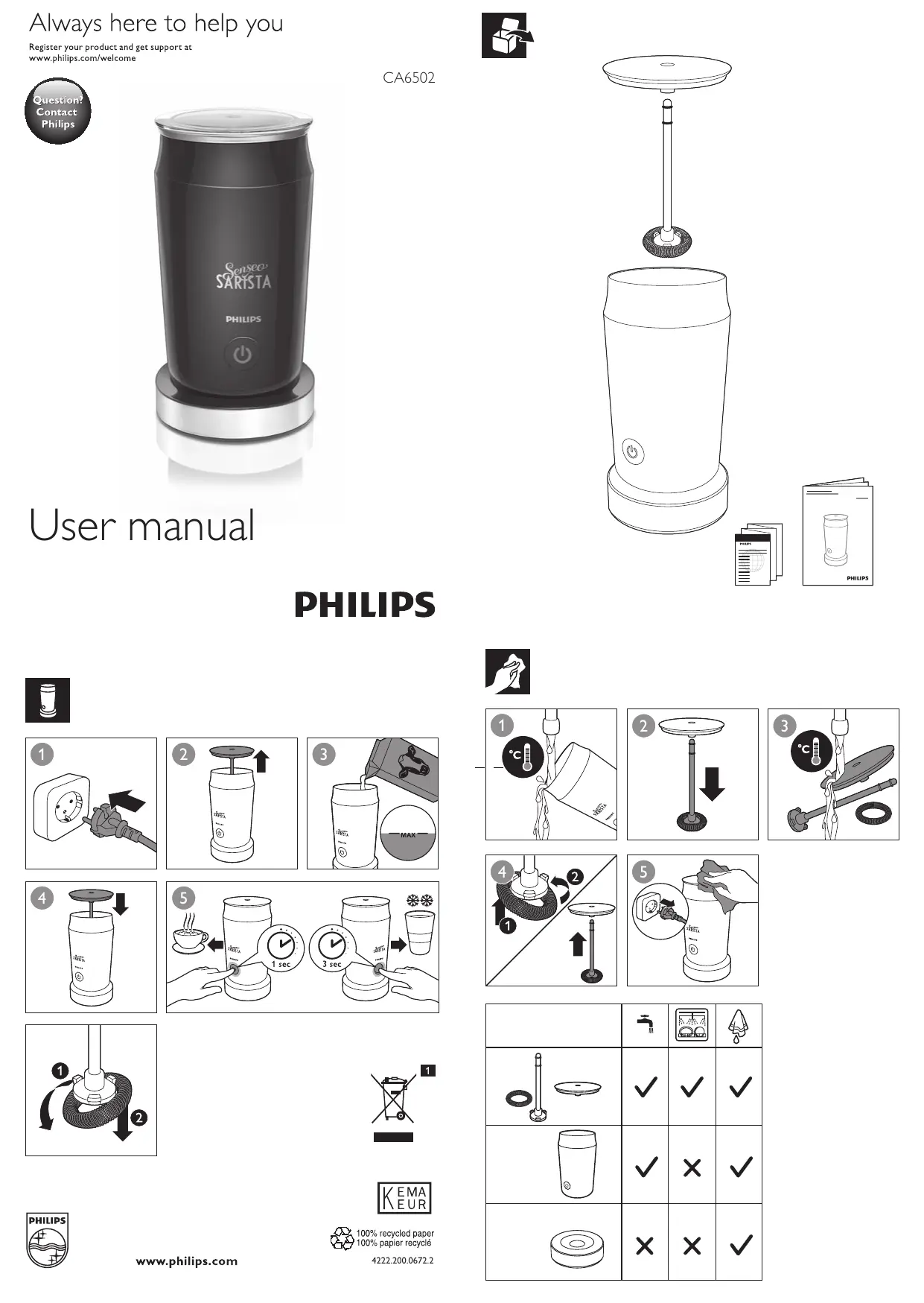 CA6502/62 - Mousseur à lait PHILIPS - Notice d'utilisation et mode d'emploi gratuit