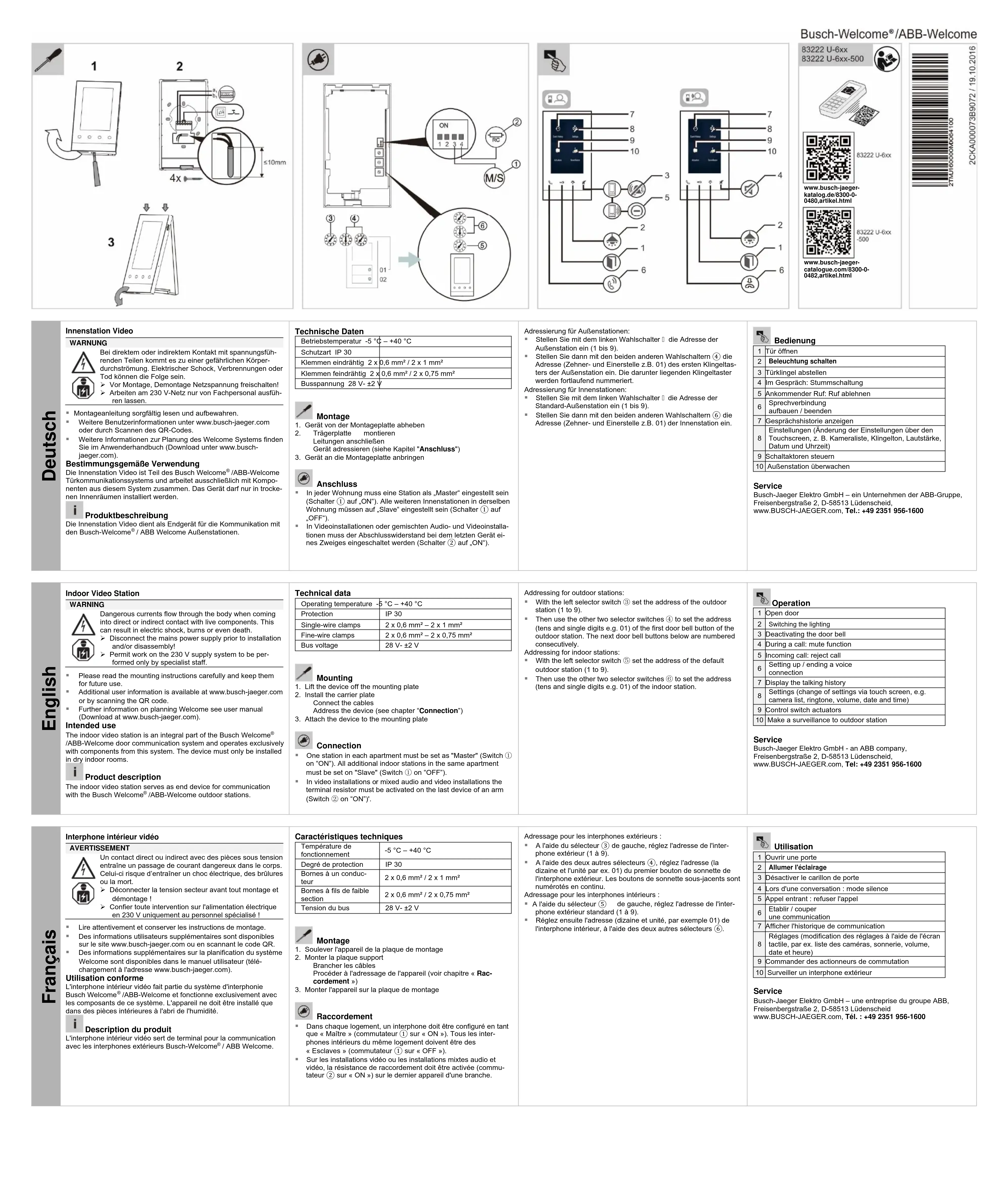 L'Interphone interieur video fait parte du système d'intéphonie Busch Welcome/ABB-Welcome et fonctionnelle exclusively avec les compositants de ce système. L'apparent ne doit être installée que dans des pieces interieures à l'âpri de l'humidité.