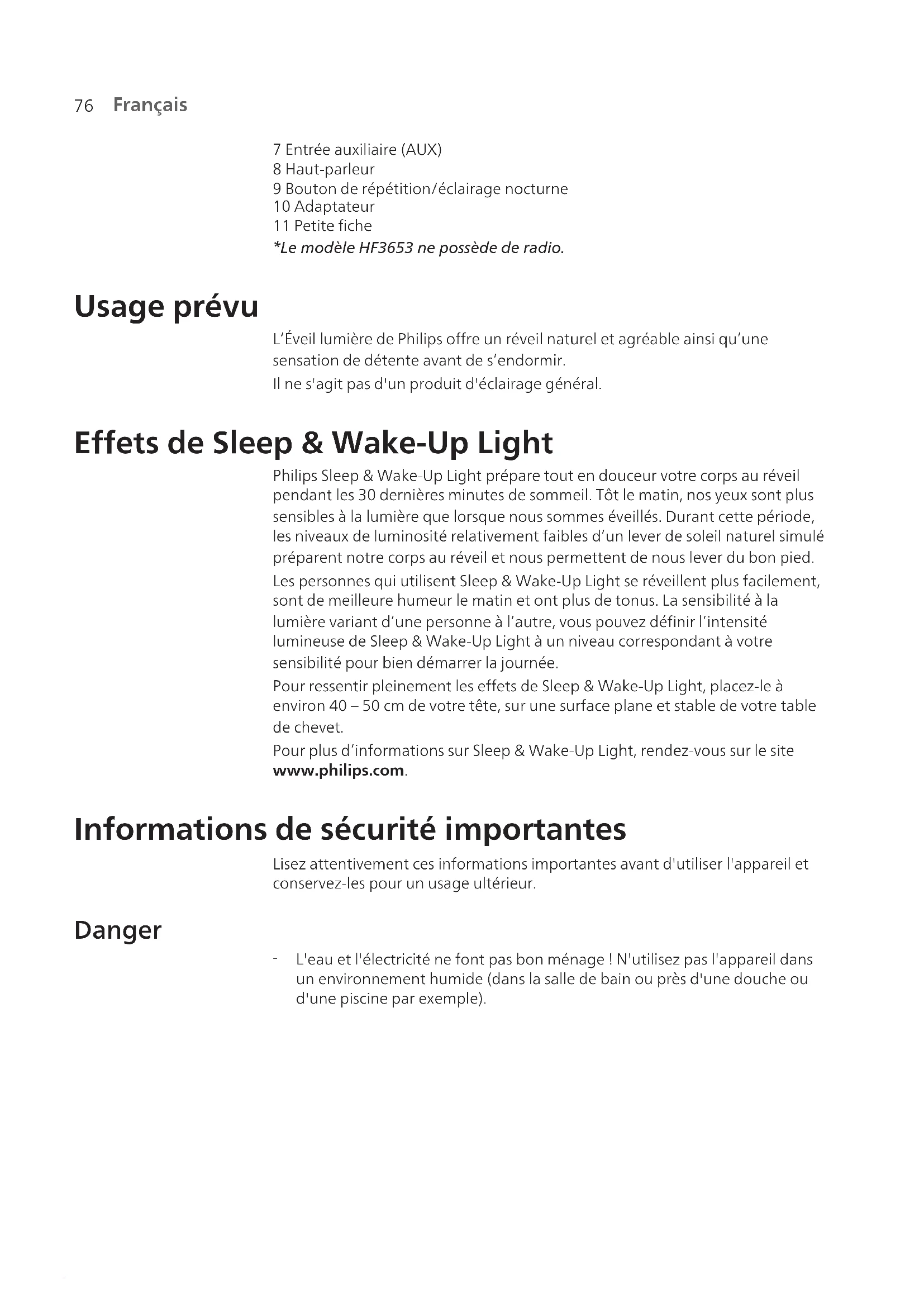 Français Sommaire Introduction _____________________________________________________________________________ 75 Description générale_______________________________________________________________________ 75 Usage prévu ______________________________________________________________________________ 76 Effets de Sleep & Wake-Up Light ____________________________________________________________ 76 Informations de sécurité importantes ________________________________________________________ 76 Sécurité et conformité _____________________________________________________________________ 78 Champs électromagnétiques (CEM)__________________________________________________________ 78 Icônes du menu interactif __________________________________________________________________ 79 Navigation dans le menu ___________________________________________________________________ 80 Réglage des profils de réveil ________________________________________________________________ 80 Horloge + alarme de secours________________________________________________________________ 81 Répétition ________________________________________________________________________________ 81 Ignorer l’alarme ___________________________________________________________________________ 82 Utilisation de Sleep & Wake-Up Light comme lampe de chevet __________________________________ 82 Éclairage nocturne ________________________________________________________________________ 82 Paramètres _______________________________________________________________________________ 83 Musique _________________________________________________________________________________ 84 Programmes de détente____________________________________________________________________ 85 Charge du téléphone portable ______________________________________________________________ 87 Nettoyage et rangement ___________________________________________________________________ 87 Recyclage ________________________________________________________________________________ 87 Garantie et assistance______________________________________________________________________ 87 Dépannage_______________________________________________________________________________ 88 Logiciels libres et tiers______________________________________________________________________ 90 Caractéristiques techniques_________________________________________________________________ 90 Introduction Félicitations pour votre achat et bienvenue dans l'univers Philips! Pour profiter pleinement de l'assistance offerte par Philips, enregistrez votre produit à l'adresse suivante: www.philips.com/welcome. L’Éveil lumière permet de vous réveiller plus agréablement. Si la simulation de l’aube est activée, l’intensité lumineuse de la lampe augmente progressivement jusqu’au niveau sélectionné et la couleur de la lumière passe du rouge profond de l’aube à la lumière du jour. La lumière prépare doucement votre corps à se réveiller à l’heure programmée. Pour vous assurer un réveil encore plus agréable, vous pouvez utiliser des sons de réveil naturels ou la radio FM*. *Le modèle HF3653 ne possède de radio. Description générale 1 Corps de la lampe 2 Afficheur 3 Port de charge USB 4 Bouton de réinitialisation 5 Antenne radio* 6 Adaptateur de prise CC76 Français 7 Entrée auxiliaire (AUX) 8 Haut-parleur 9 Boutonde répétition/éclairage nocturne 10 Adaptateur 11 Petite fiche *Le modèle HF3653 ne possède de radio. Usage prévu L’Éveil lumière de Philipsoffre un réveil naturel et agréable ainsi qu’une sensation de détente avant de s’endormir. Il ne s'agit pas d'un produit d'éclairage général. Effets de Sleep & Wake-Up Light Philips Sleep & Wake-Up Light prépare tout en douceur votre corps au réveil pendant les 30dernières minutes de sommeil. Tôt le matin, nos yeux sont plus sensibles à la lumière que lorsque nous sommes éveillés. Durant cette période, les niveaux de luminosité relativement faibles d’un lever de soleil naturel simulé préparent notre corps au réveil et nous permettent de nous lever du bon pied. Les personnes qui utilisent Sleep & Wake-Up Light se réveillent plus facilement, sont de meilleure humeur le matin et ont plus de tonus. La sensibilité à la lumière variant d’une personne à l’autre, vous pouvez définir l’intensité lumineuse de Sleep & Wake-Up Light à un niveau correspondant à votre sensibilité pour bien démarrer la journée. Pour ressentir pleinement les effets de Sleep & Wake-Up Light, placez-le à environ 40–50cm de votre tête, sur une surface plane et stable de votre table de chevet. Pour plus d’informations sur Sleep & Wake-Up Light, rendez-vous sur le site www.philips.com. Informations de sécurité importantes Lisez attentivement ces informations importantes avant d'utiliser l'appareil et conservez-les pour un usage ultérieur. Danger