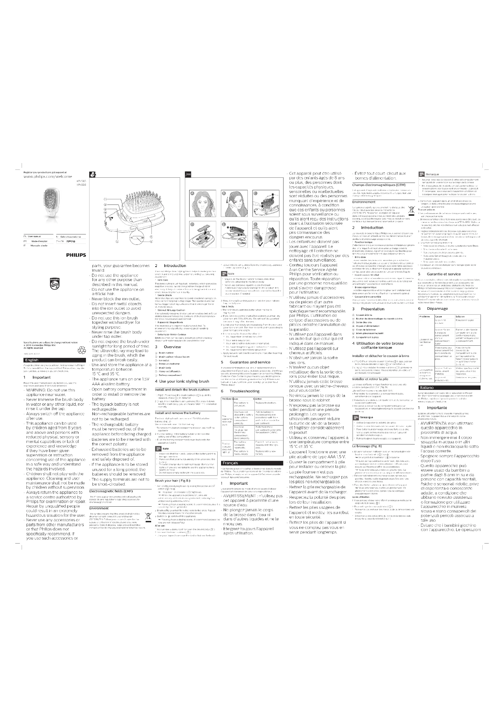 - Assurez-vous que le coussin à brins est complètement sec avant de le réinstaller sur le corps de la brosse.• N'utilisez jamais de produits corrosifs pour nettoyer le coussin à brins car ils peuvent endommager le produit. Si nécessaire, nous vous recommandons d'utiliser un détergent ménager pour nettoyer le coussin à brins. 3 Conservez l’appareil dans un endroit sûr et sec ou rangez-le dans votre trousse de maquillage pour une utilisation quotidienne. Trucs et astuces1 Les performances de la brosse ionique sont meilleures sur cheveux humides.2 Si vous souhaitez utiliser la brosse après vous être lavé les cheveux, séchez-vous les cheveux à 70 %-80%. Veillez à ne pas trop sécher vos cheveux car cela pourrait aecter le résultat. 3 Peignez délicatement vos cheveux à plusieurs reprises en partant de la racine jusqu’à ce qu’ils soient lisses. Le temps de brossage varie en fonction de votre longueur et de votre type de cheveux.4 Les eets seront peu visibles si :• Vous avez les cheveux courts ou naturellement frisés.• Vos cheveux bouclent facilement.• Vos cheveux sont trop secs ou abîmés.• Vous avez fait un lissage au cours des 3 à 4 derniers mois.• Vous avez des mèches courtes.5 Appliquez un soin revitalisant sans rinçage après avoir brossé vos cheveux. 5 Garantie et service Si vous souhaitez obtenir des informations supplémentaires, par exemple sur le remplacement d’un accessoire, ou si vous rencontrez un problème, visitez le site Web de Philips à l’adresse www.philips.com/support ou contactez le Service Consommateurs Philips de votre pays (vous trouverez le numéro de téléphone correspondant sur le dépliant de garantie internationale). S’il n’existe pas de Service Consommateurs dans votre pays, adressez-vous à votre revendeur Philips. 6 Dépannage Problème Cause SolutionL'appareil ne fonctionne pas. La pile est épuisée.Remplacez la pile.La pile n'a pas été placée correctement dans le compartiment à pile.Placez la pile dans le compartiment à pile conformément à la polarité indiquée dans le compartiment.Vous n'avez pas correctement xé le couvercle du compartiment à piles.Positionnez le couvercle du compartiment à pile sur l'appareil en le faisant glisser jusqu'à ce qu'il s'enclenche (« clic »).Le voyant de la fonction ionique ne s'allume pas.La pile n'est pas correctement installée.Vériez que la polarité des piles a bien été respectée.La pile est presque vide.Remplacez les piles. Italiano Congratulazioni per l’acquisto e benvenuti in Philips! Per trarre il massimo vantaggio dall’assistenza fornita da Philips, registrare il proprio prodotto sul sito www.philips.com/welcome. 1 Importante Leggere attentamente il presente manuale prima di utilizzare l’apparecchio e conservarlo come riferimento futuro.• AVVERTENZA: non utilizzare questo apparecchio in prossimità di acqua.