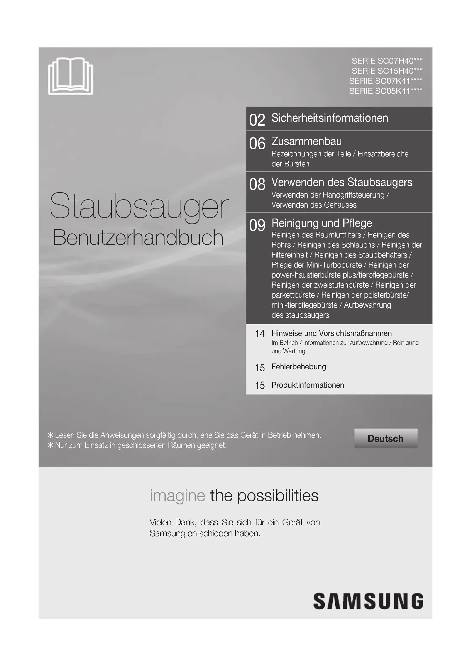 SC07H40@@V SERIES_3ge_00724B-12_EN.indb 15 2019-06-24 오후 2:10:31SC07H40@@V SERIES_3ge_00724B-12_EN.indb 16 2019-06-24 오후 2:10:31Français✻ Avant d'utiliser cet appareil, veuillez lire attentivement les instructions.✻ Utilisation en intérieur uniquement. imagine the possibilities Merci d'avoir choisi un produit Samsung. Aspirateur manuel d'utilisation SÉRIE SC07H40***SÉRIE SC15H40***SÉRIE SC07K41**** SÉRIE SC05K41**** Inhalt