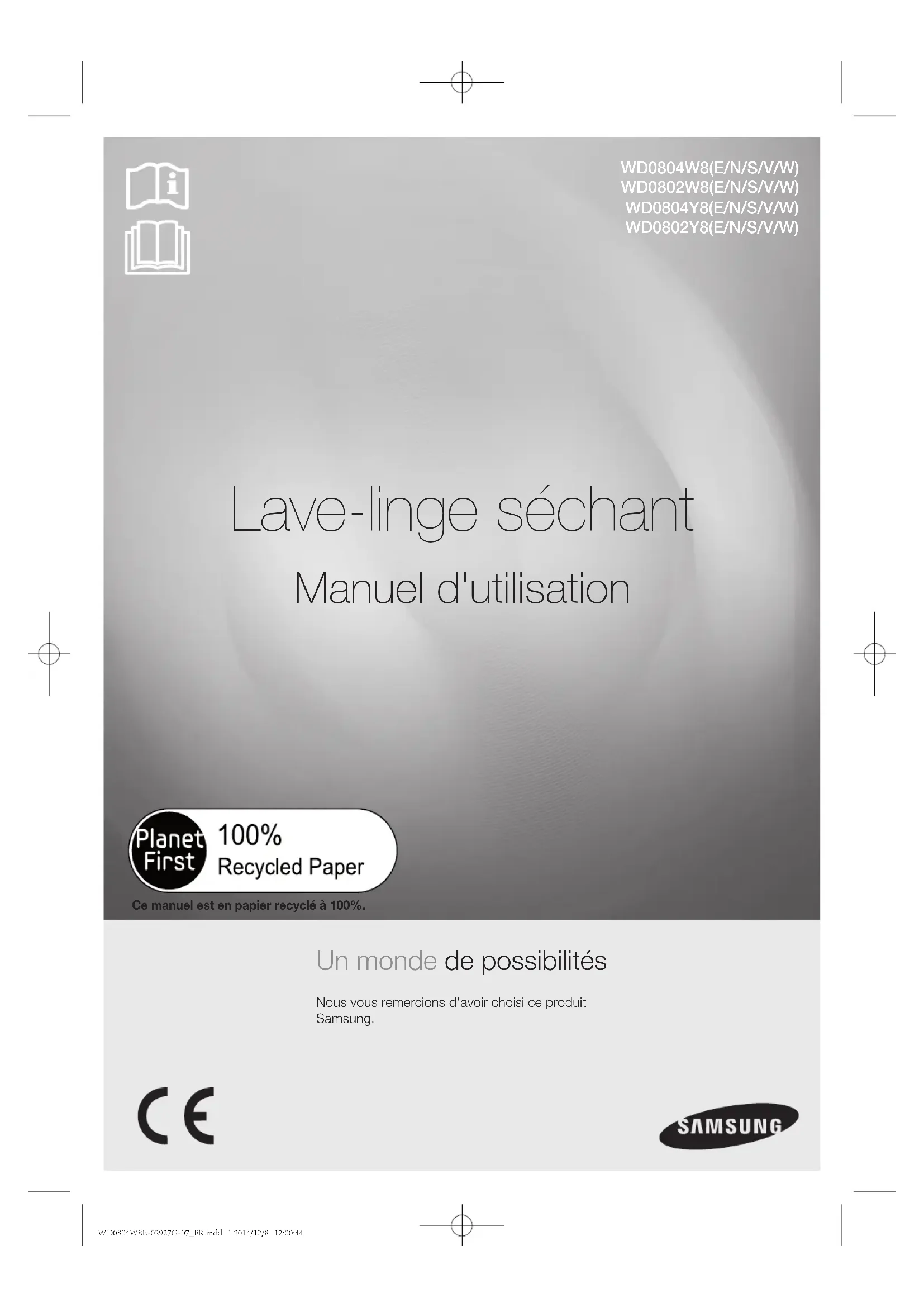 Ce manuel est en papier recyclé à 100%. Lave-linge séchant Manuel d'utilisation Un monde de possibilités Nous vous remercions d'avoir choisi ce produit Samsung. WD0804W8(E/N/S/V/W) WD0802W8(E/N/S/V/W) WD0804Y8(E/N/S/V/W) WD0802Y8(E/N/S/V/W) WD0804W8E-02927G-07_FR.indd 1 2014/12/8 12:00:44Français - 2 contenu installer le lave-linge