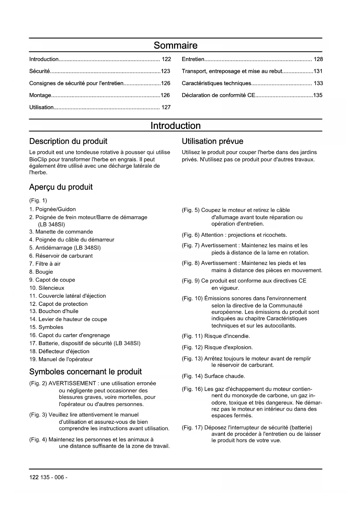 Symboles concernant le produit (Fig. 2) AVERTISSEMENT : une utilisation erronée ou négligente peut occasionner des blessures graves, voire mortelles, pour l'opérateur ou d'autres personnes. (Fig. 3) Veuillez lire attentivement le manuel d'utilisation et assurez-vous de bien comprendre les instructions avant utilisation. (Fig. 4) Maintenez les personnes et les animaux à une distance suffisante de la zone de travail. (Fig. 5) Coupez le moteur et retirez le câble d'allumage avant toute réparation ou opération d'entretien. (Fig. 6) Attention : projections et ricochets. (Fig. 7) Avertissement : Maintenez les mains et les pieds à distance de la lame en rotation. (Fig. 8) Avertissement : Maintenez les pieds et les mains à distance des pièces en mouvement. (Fig. 9) Ce produit est conforme aux directives CE en vigueur. (Fig. 10) Émissions sonores dans l'environnement selon la directive de la Communauté européenne. Les émissions du produit sont indiquées au chapitre Caractéristiques techniques et sur les autocollants. (Fig. 11) Risque d'incendie. (Fig. 12) Risque d'explosion. (Fig. 13) Arrêtez toujours le moteur avant de remplir le réservoir de carburant. (Fig. 14) Surface chaude. (Fig. 16) Les gaz d'échappement du moteur contien- nent du monoxyde de carbone, un gaz in- odore, toxique et très dangereux. Ne démar- rez pas le moteur en intérieur ou dans des espaces fermés. (Fig. 17) Déposez l'interrupteur de sécurité (batterie) avant de procéder à l'entretien ou de laisser le produit hors de votre vue. 122 135 - 006 -(Fig. 18) Procédure de démarrage pour LB 248S, LB 253S : Poussez la poignée du frein mo- teur vers le bas et tirez la poignée du câble du démarreur. (Fig. 19) Procédure de démarrage pour LB 348SI : Relâchez l'antidémarrage et poussez la barre de démarrage vers le bas. (Fig. 15) Code optiquement lisible. Remarque: Les autres symboles/autocollants présents sur le produit concernent des exigences de certification spécifiques à certaines zones commerciales. Responsabilité Conformément à la loi sur la responsabilité du fait des produits, nous déclinons toute responsabilité pour tout dommage causé par notre produit si :