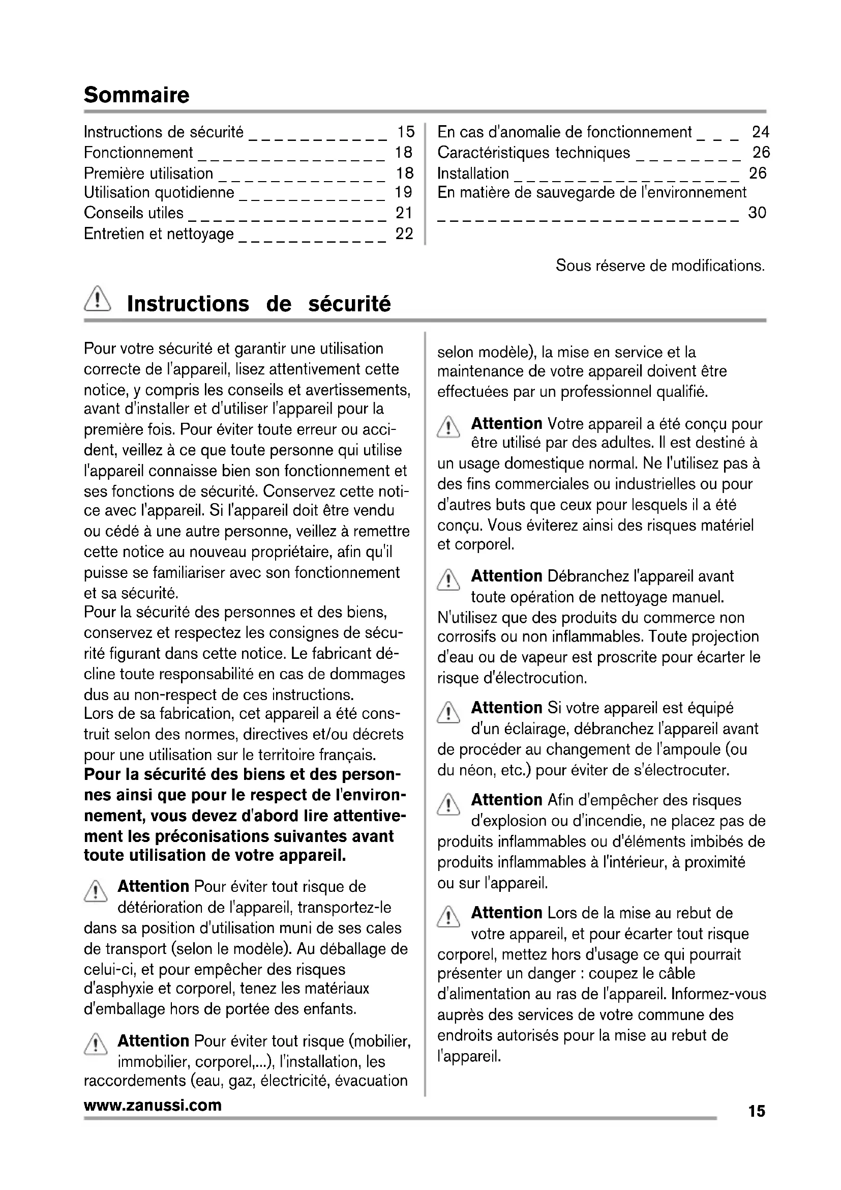 www.zanussi.comSommaire Instructions de sécurité _ _ _ _ _ _ _ _ _ _ _ 15 Fonctionnement _ _ _ _ _ _ _ _ _ _ _ _ _ _ _ 18 Première utilisation _ _ _ _ _ _ _ _ _ _ _ _ _ 18 Utilisation quotidienne _ _ _ _ _ _ _ _ _ _ _ _ 19 Conseils utiles _ _ _ _ _ _ _ _ _ _ _ _ _ _ _ _ 21 Entretien et nettoyage _ _ _ _ _ _ _ _ _ _ _ _ 22 En cas d'anomalie de fonctionnement _ _ _ 24 Caractéristiques techniques _ _ _ _ _ _ _ _ 26 Installation _ _ _ _ _ _ _ _ _ _ _ _ _ _ _ _ _ _ 26 En matière de sauvegarde de l'environnement _ _ _ _ _ _ _ _ _ _ _ _ _ _ _ _ _ _ _ _ _ _ _ _ 30 Sous réserve de modifications. Instructions de sécurité Pour votre sécurité et garantir une utilisation correcte de l'appareil, lisez attentivement cette notice, y compris les conseils et avertissements, avant d'installer et d'utiliser l'appareil pour la première fois. Pour éviter toute erreur ou acci- dent, veillez à ce que toute personne qui utilise l'appareil connaisse bien son fonctionnement et ses fonctions de sécurité. Conservez cette noti- ce avec l'appareil. Si l'appareil doit être vendu ou cédé à une autre personne, veillez à remettre cette notice au nouveau propriétaire, afin qu'il puisse se familiariser avec son fonctionnement et sa sécurité. Pour la sécurité des personnes et des biens, conservez et respectez les consignes de sécu- rité figurant dans cette notice. Le fabricant dé- cline toute responsabilité en cas de dommages dus au non-respect de ces instructions. Lors de sa fabrication, cet appareil a été cons- truit selon des normes, directives et/ou décrets pour une utilisation sur le territoire français. Pour la sécurité des biens et des person- nes ainsi que pour le respect de l'environ- nement, vous devez d'abord lire attentive- ment les préconisations suivantes avant toute utilisation de votre appareil. Attention Pour éviter tout risque de détérioration de l'appareil, transportez-le dans sa position d'utilisation muni de ses cales de transport (selon le modèle). Au déballage de celui-ci, et pour empêcher des risques d'asphyxie et corporel, tenez les matériaux d'emballage hors de portée des enfants. Attention Pour éviter tout risque (mobilier, immobilier, corporel,...), l'installation, les raccordements (eau, gaz, électricité, évacuation selon modèle), la mise en service et la maintenance de votre appareil doivent être effectuées par un professionnel qualifié. Attention Votre appareil a été conçu pour être utilisé par des adultes. Il est destiné à un usage domestique normal. Ne l'utilisez pas à des fins commerciales ou industrielles ou pour d'autres buts que ceux pour lesquels il a été conçu. Vous éviterez ainsi des risques matériel et corporel. Attention Débranchez l'appareil avant toute opération de nettoyage manuel. N'utilisez que des produits du commerce non corrosifs ou non inflammables. Toute projection d'eau ou de vapeur est proscrite pour écarter le risque d'électrocution. Attention Si votre appareil est équipé d'un éclairage, débranchez l'appareil avant de procéder au changement de l'ampoule (ou du néon, etc.) pour éviter de s'électrocuter. Attention Afin d'empêcher des risques d'explosion ou d'incendie, ne placez pas de produits inflammables ou d'éléments imbibés de produits inflammables à l'intérieur, à proximité ou sur l'appareil. Attention Lors de la mise au rebut de votre appareil, et pour écarter tout risque corporel, mettez hors d'usage ce qui pourrait présenter un danger : coupez le câble d'alimentation au ras de l'appareil. Informez-vous auprès des services de votre commune des endroits autorisés pour la mise au rebut de l'appareil.