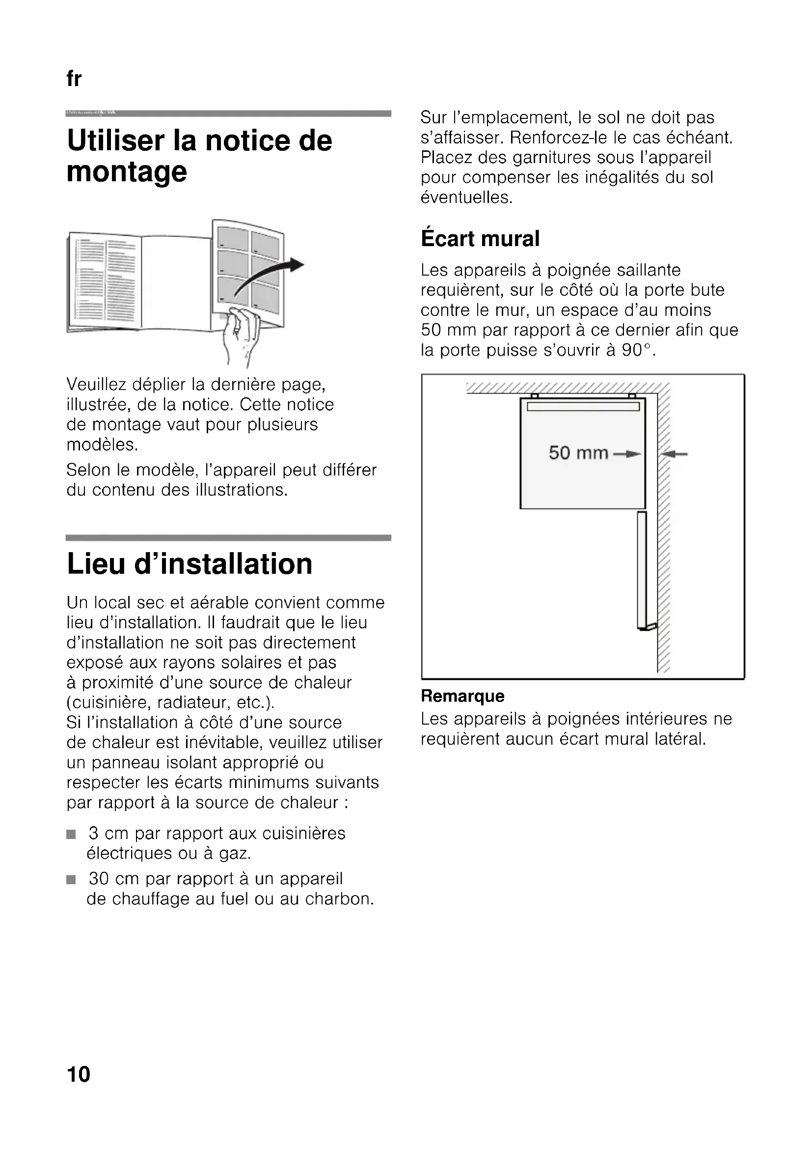 frTable des matièresfrNotice de montageAppareil indépendant Utiliser la notice de montage Veuillez déplier la dernière page, illustrée, de la notice. Cette notice de montage vaut pour plusieurs modèles. Selon le modèle, l’appareil peut différer du contenu des illustrations. Lieu d’installation Un local sec et aérable convient comme lieu d’installation. Il faudrait que le lieu d’installation ne soit pas directement exposé aux rayons solaires et pas à proximité d’une source de chaleur (cuisinière, radiateur, etc.). Si l’installation à côté d’une source de chaleur est inévitable, veuillez utiliser un panneau isolant approprié ou respecter les écarts minimums suivants par rapport à la source de chaleur : ■ 3 cm par rapport aux cuisinières électriques ou à gaz. ■ 30 cm par rapport à un appareil de chauffage au fuel ou au charbon. Sur l’emplacement, le sol ne doit pas s’affaisser. Renforcez-le le cas échéant. Placez des garnitures sous l’appareil pour compenser les inégalités du sol éventuelles. Écart mural Les appareils à poignée saillante requièrent, sur le côté où la porte bute contre le mur, un espace d’au moins 50 mm par rapport à ce dernier afin que la porte puisse s’ouvrir à 90°. Remarque Les appareils à poignées intérieures ne requièrent aucun écart mural latéral.fr