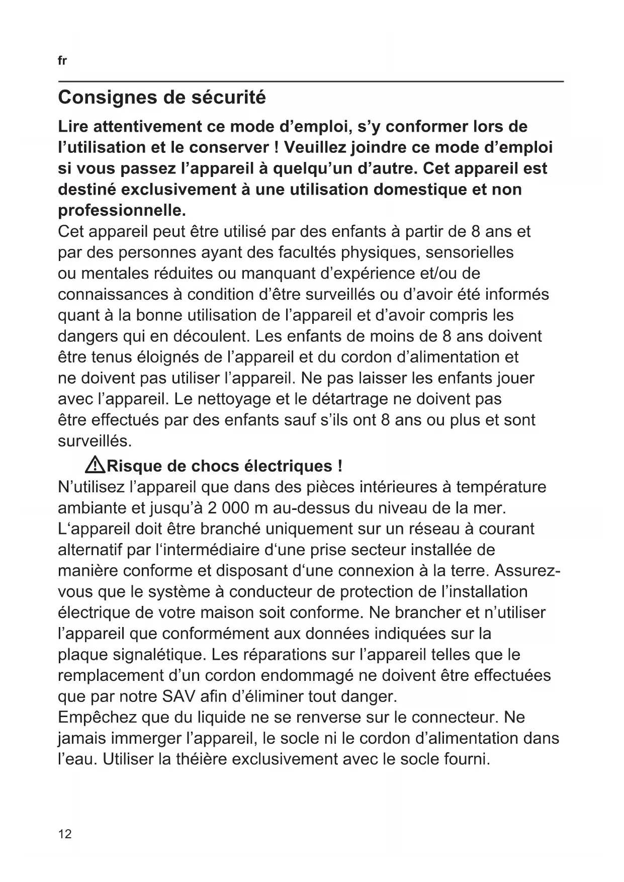 Consignes de sécurité Lire attentivement ce mode d’emploi, s’y conformer lors de l’utilisation et le conserver ! Veuillez joindre ce mode d’emploi si vous passez l’appareil à quelqu’un d’autre. Cet appareil est destiné exclusivement à une utilisation domestique et non professionnelle. Cet appareil peut être utilisé par des enfants à partir de 8 ans et par des personnes ayant des facultés physiques, sensorielles ou mentales réduites ou manquant d’expérience et/ou de connaissances à condition d’être surveillés ou d’avoir été informés quant à la bonne utilisation de l’appareil et d’avoir compris les dangers qui en découlent. Les enfants de moins de 8 ans doivent être tenus éloignés de l’appareil et du cordon d’alimentation et ne doivent pas utiliser l’appareil. Ne pas laisser les enfants jouer avec l’appareil. Le nettoyage et le détartrage ne doivent pas être effectués par des enfants sauf s’ils ont 8 ans ou plus et sont surveillés. WRisque de chocs électriques ! N’utilisez l’appareil que dans des pièces intérieures à température ambiante et jusqu’à 2 000 m au-dessus du niveau de la mer. L‘appareil doit être branché uniquement sur un réseau à courant alternatif par l‘intermédiaire d‘une prise secteur installée de manière conforme et disposant d‘une connexion à la terre. Assurez- vous que le système à conducteur de protection de l’installation électrique de votre maison soit conforme. Ne brancher et n’utiliser l’appareil que conformément aux données indiquées sur la plaque signalétique. Les réparations sur l’appareil telles que le remplacement d’un cordon endommagé ne doivent être effectuées que par notre SAV afin d’éliminer tout danger. Empêchez que du liquide ne se renverse sur le connecteur. Ne jamais immerger l’appareil, le socle ni le cordon d’alimentation dans l’eau. Utiliser la théière exclusivement avec le socle fourni.13