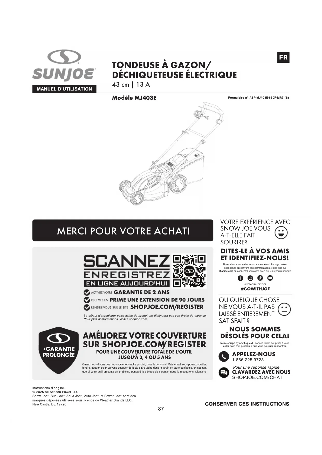 Pour une réponse rapideCLAVARDEZ AVEC NOUS SHOPJOE.COM/CHATFormulaire n° ASP-MJ403E-880F-MR7 (S) Modèle MJ403E TONDEUSE À GAZON/