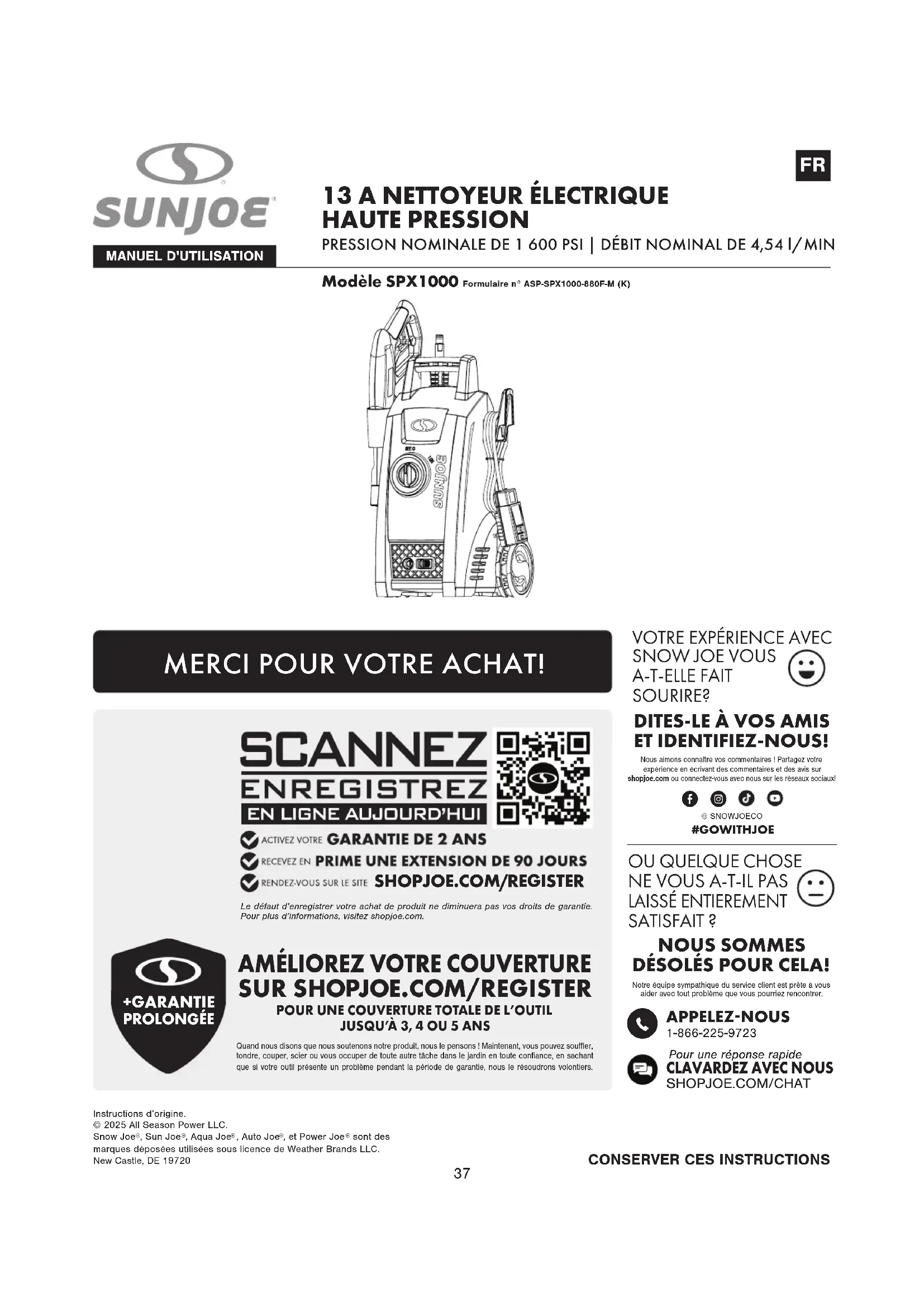 HAUTE PRESSION PRESSION NOMINALE DE 1 600 PSI | DÉBIT NOMINAL DE 4,54 l/MIN CONSERVER CES INSTRUCTIONSInstructions d’origine.© 2025 All Season Power LLC.Snow Joe , Sun Joe , Aqua Joe , Auto Joe , et Power Joe sont des marques déposées utilisées sous licence de Weather Brands LLC.New Castle, DE 19720