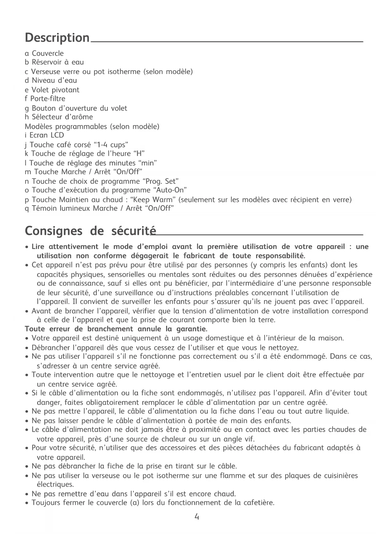min prog-setauto-onon-o keep warm 3Description a Couvercle b Réservoir à eau c Verseuse verre ou pot isotherme (selon modèle) d Niveau d’eau e Volet pivotant f Porte-filtre g Bouton d’ouverture du volet h Sélecteur d’arôme Modèles programmables (selon modèle) i Ecran LCD j Touche café corsé “1-4 cups” k Touche de réglage de l’heure “H” l Touche de réglage des minutes “min” m Touche Marche / Arrêt “On/Off” n Touche de choix de programme “Prog. Set” o Touche d’exécution du programme “Auto-On” p Touche Maintien au chaud : “Keep Warm” (seulement sur les modèles avec récipient en verre) q Témoin lumineux Marche / Arrêt “On/Off” Consignes de sécurité