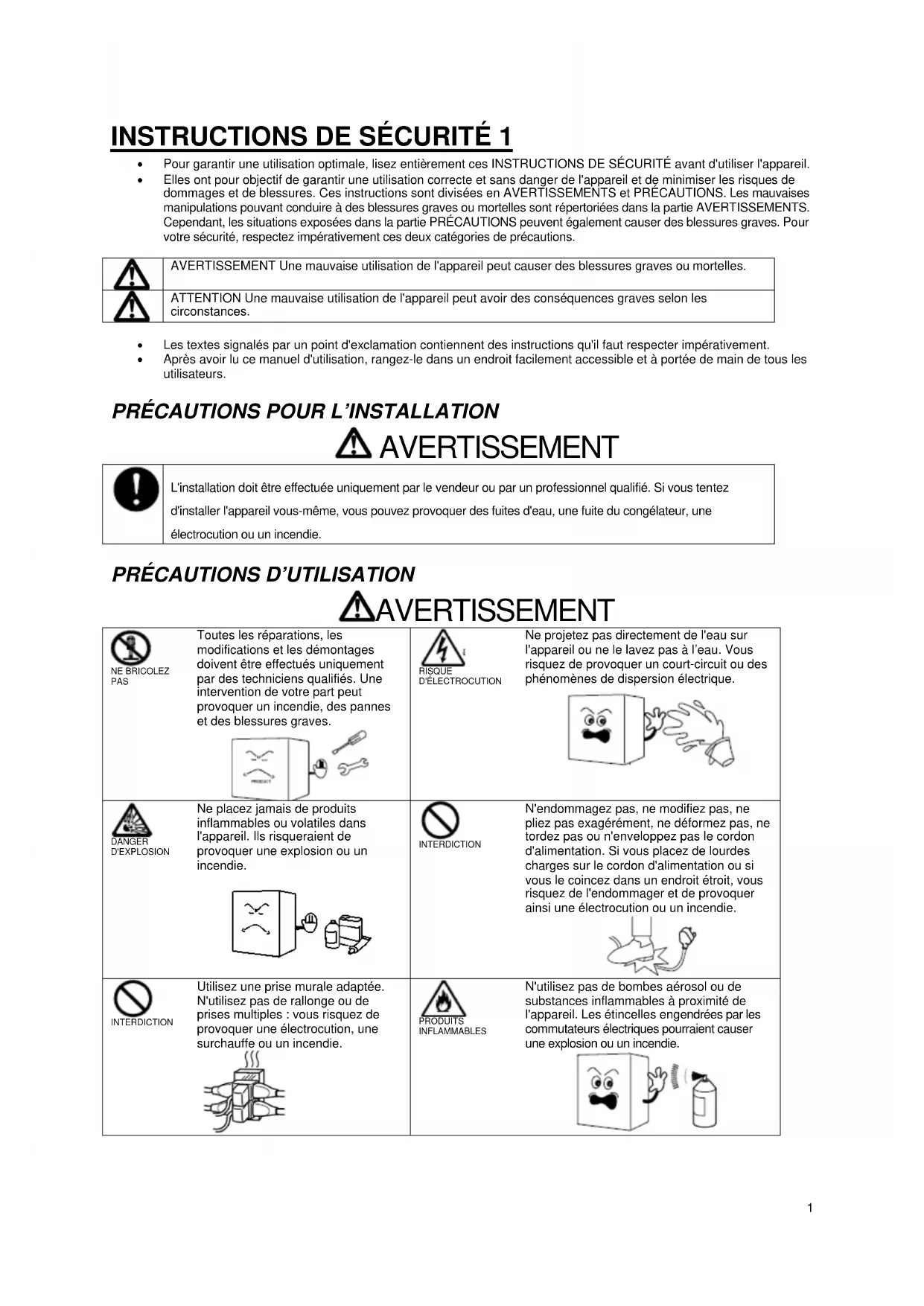 | INTERDICTION | Ne vous suspendez pas à la porte et ne montez pas sur l'appareil. Il pourrait basculer ou tomber, provoquant ainsi des dommages ou des blessures graves. | DébrANCHÉZ LA FICHE D'ALIMENTATION DE LA PRESE MURALE | Débranchez la fiche d'alimentation de la prise murale avant de déplacer l'appareil et veiller à ce que le cordon d'alimentation ne soit pas endommagé durant le transport. Un cordon d'alimentation endommagé peut provoquer une électrocution ou un incendie. |