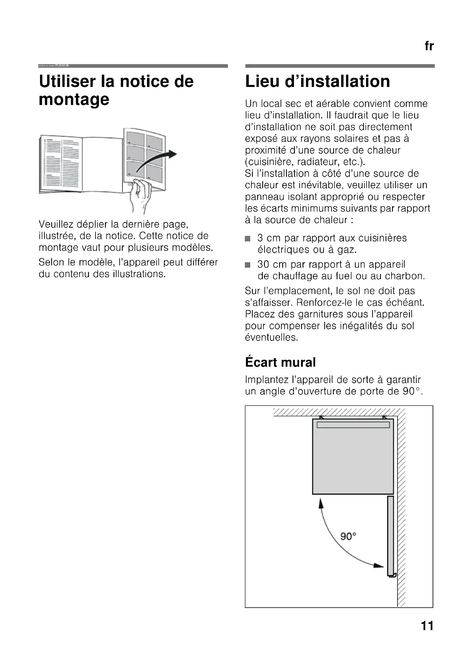 frTable des matières frNotic e de montage Appareil indépendant Utiliser la notice de montage Veuillez déplier la dernière page, illustrée, de la notice. Cette notice de montage vaut pour plusieurs modèles. Selon le modèle, l’appareil peut différer du contenu des illustrations. Lieu d’installation Un local sec et aérable convient comme lieu d’installation. Il faudrait que le lieu d’installation ne soit pas directement exposé aux rayons solaires et pas à proximité d’une source de chaleur (cuisinière, radiateur, etc.). Si l’installation à côté d’une source de chaleur est inévitable, veuillez utiliser un panneau isolant approprié ou respecter les écarts minimums suivants par rapport à la source de chaleur : ■ 3 cm par rapport aux cuisinières électriques ou à gaz. ■ 30 cm par rapport à un appareil de chauffage au fuel ou au charbon. Sur l’emplacement, le sol ne doit pas s’affaisser. Renforcez-le le cas échéant. Placez des garnitures sous l’appareil pour compenser les inégalités du sol éventuelles. Écart mural Implantez l’appareil de sorte à garantir un angle d’ouverture de porte de 90°.fr