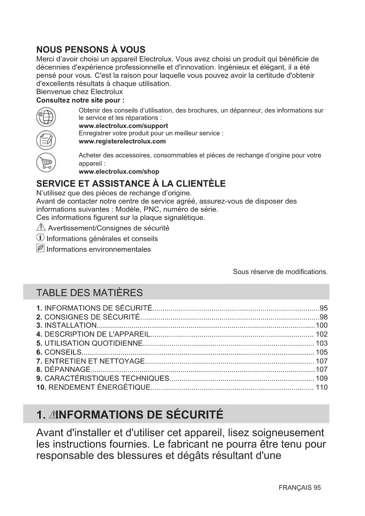 Merci d’avoir choisi un appareil Electrolux. Vous avez choisi un produit qui bénéficie de décennies d'expérience professionnelle et d'innovation. Ingénieux et élégant, il a été pensé pour vous. C'est la raison pour laquelle vous pouvez avoir la certitude d'obtenir d'excellents résultats à chaque utilisation. Bienvenue chez Electrolux Consultez notre site pour :Obtenir des conseils d’utilisation, des brochures, un dépanneur, des informations surle service et les réparations :www.electrolux.com/supportEnregistrer votre produit pour un meilleur service :www.registerelectrolux.comAcheter des accessoires, consommables et pièces de rechange d’origine pour votreappareil :www.electrolux.com/shop
