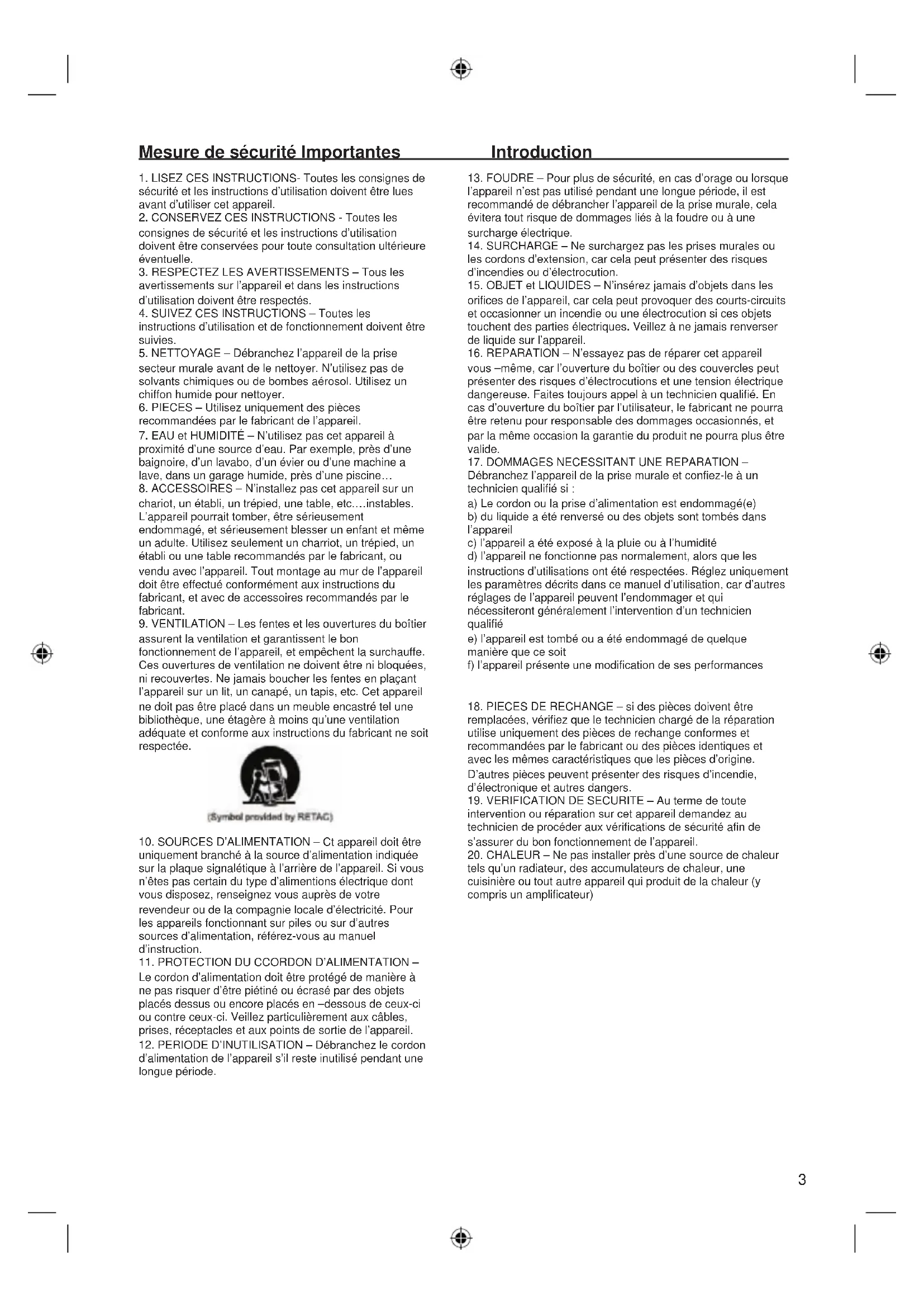 appareil à la pluie.3 Mesure de sécurité Importantes Introduction