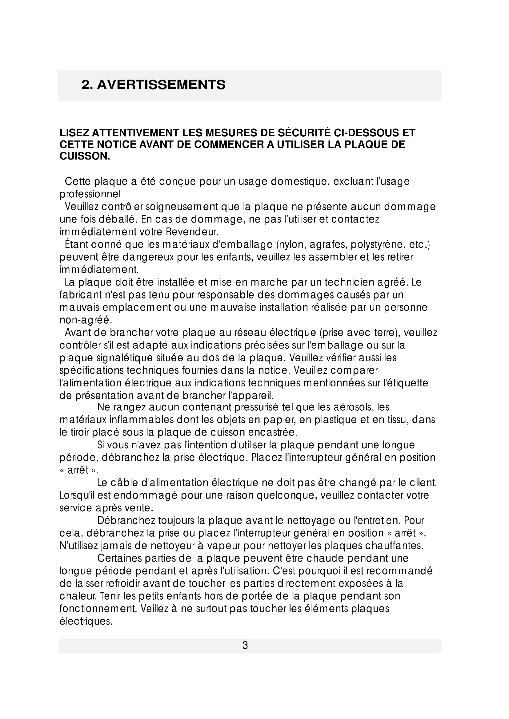 2.AVERTISSEMENTSNelaissezpasdematièresinflammablesprèsdeIaplaquelorsqu’elleesten fonctionnement. Faitesattentionauxcâblesd’alimentationdesautresappareils électriquesquisetrouventprèsdeI'appareil,afinqu'ilsnesoientpasen contactavecleszoneschaudes. Veillezàcequelesmanettesdelaplaquesoientbiensur«0»lorsque I'appareiln'estpasenmarche. Sidesfissuresapparaissentsurlesplaquesélectriques,ilestimpératifd’arrêter immédiatementl’alimentationélectriqueafindeprévenirtoutrisque d’électrocution. Cettenoticeaétéconçuepourplusieursmodèles.Votreplaquene comprendpeut-êtrepastouteslesoptionsdécritesdanscettenotice.Veuillez doncbienfaireattentionauxindicationsetauxschémascontenusdanscette notice. POURL’EFFlCACITEETLASECURITEDELAPLAQUE,NOUSVOUSRECOMMANDONS D'UTILISERUNIQUEMENTLESPIECESDETACHEESD’ORIGINEETDENEFAIREAPPEL QU’AUSERVICEAPRESVENTEAGREEDUREVENDEURENCASDEBESOIN