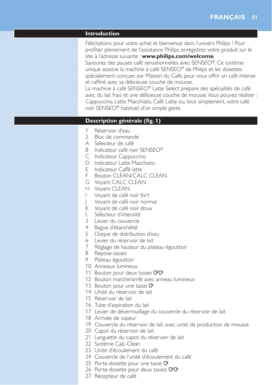La machine à café SENSEO® Latte Select prépare des spécialités de café avec du lait frais et une délicieuse couche de mousse. Vous pouvez réaliser : Cappuccino, Latte Macchiato, Café Latte ou, tout simplement, votre café noir SENSEO® habituel, d’un simple geste. Description générale (fig. 1) 1 Réglage de hauteur du plateau égouttoir Repose-tasses Plateau égouttoir Anneaux lumineux Bouton pour deux tasses qq Unité du réservoir de lait Réservoir de lait Tube d’aspiration du lait Levier de déverrouillage du couvercle du réservoir de lait Arrivée de vapeur Couvercle du réservoir de lait, avec unité de production de mousse Capot du réservoir de lait Languette du capot du réservoir de lait Système Calc-Clean Unité d’écoulement du café Couvercle de l’unité d’écoulement du café Porte-dosette pour une tasse q Porte-dosette pour deux tasses qq Récepteur de café