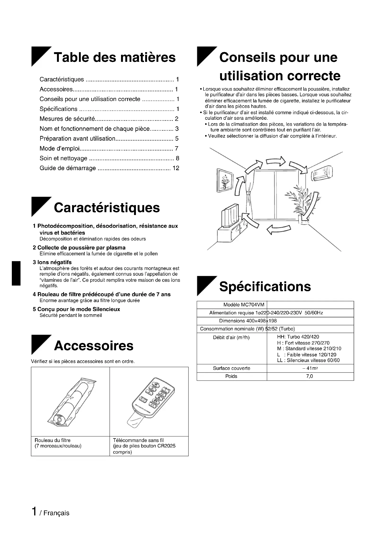 - Lorsque vous souhaitez éliminer efficacement la poussière, installez le purificateur d’air dans les pièces basses. Lorsque vous souhaitez éliminer efficacement la fumée de cigarette, installez le purificateur d’air dans les pièces hautes.• Si le purificateur d’air est installé comme indiqué ci-dessous, la cir-culation d’air sera améliorée.• Lors de la climatisation des pièces, les variations de la tempéra-ture ambiante sont contrôlées tout en purifiant l’air.• Veuillez sélectionner la diffusion d’air complète à l’intérieur. Spécifications Rouleau du filtre (7 morceaux/rouleau)Télécommande sans fil (jeu de piles bouton CR2025 compris)Modèle MC704VMAlimentation requise 1ø220-240/220-230V 50/60HzDimensions 400×498×198Consommation nominale (W) 52/52 (Turbo)Débit d’air (m