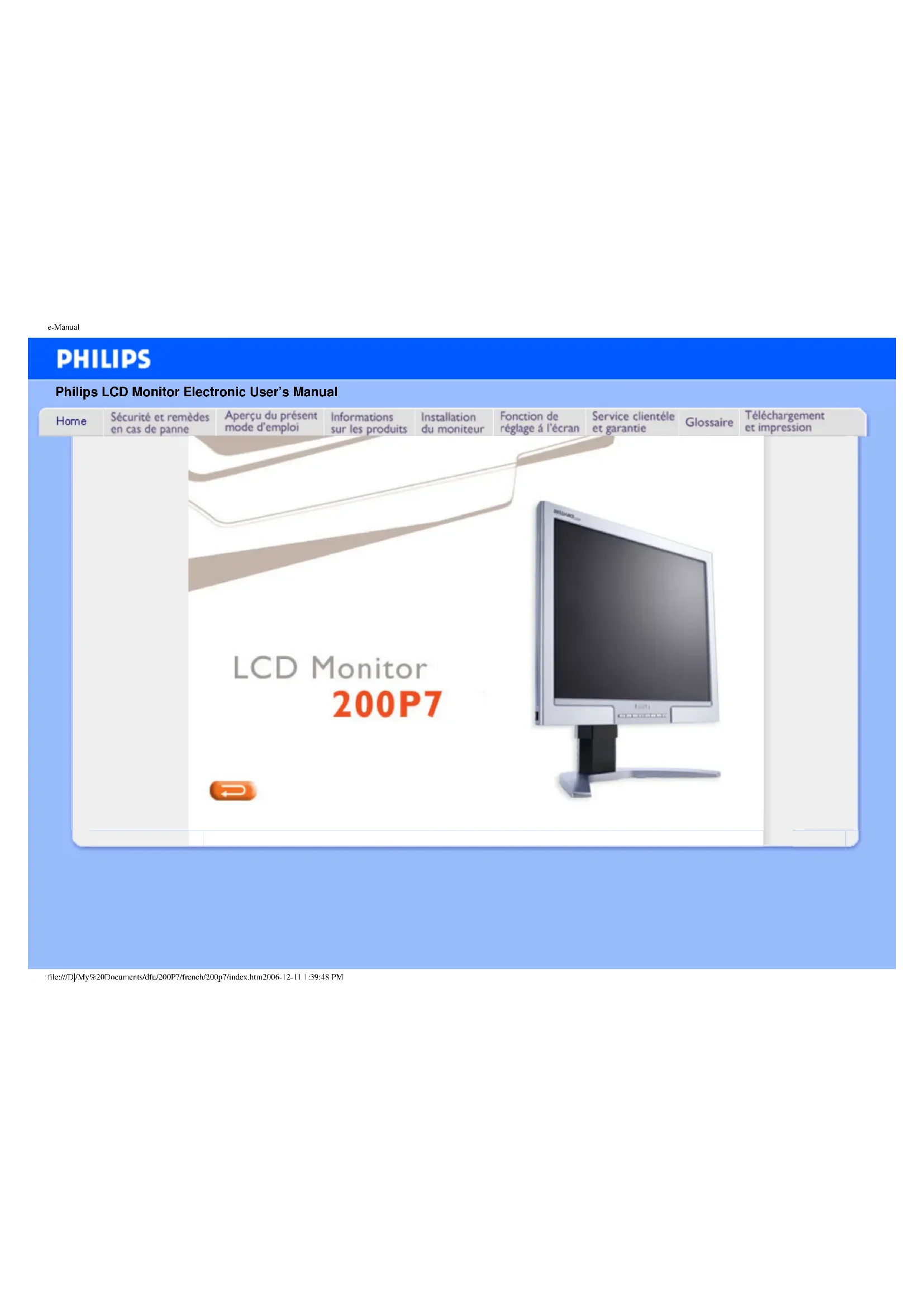Cette garantie vous confère des droits spécifiques reconnus par la loi. Il se peut que vous ayez d'autres droits qui varient d'un État à l’autre, ou d'une province à l’autre. Avant de contacter Philips, merci de rassembler les détails suivants ainsi nous pourrons résoudre votre problème plus rapidement. ● Référence / type Philips ● Numéro de série Philips file:///D|/My%20Documents/dfu/200P7/french/warranty/War_usa.htm (3 of 4)2006-12-11 1:44:02 PMGARANTIE LIMITÉE (Écran d'ordinateur) ● Date d«achat ( la photocopie de la facture peut être demandée, le cas échéant) ● Environnement PC ❍ Processeur: 286/386/486/ Pentium Pro/ ❍ Mémoire interne (Windows, DOS, OS/2, Apple Macintosh) ❍ Fax / Modem / Programme Internet ● Autres cartes installées Si nous possédons les informations suivantes, nous pourrons accélérer le processus d«adhésion : ● Votre preuve d'achat indiquant : la date d«achat, le nom du revendeur, le modèle et le numéro de série du produit. ● L'adresse complète du lieu d«échange du moniteur Juste un coup de téléphone Les services Philips d’assistance à la clientèle sont présents partout dans le monde. Pour les Etats- Unis, vous pouvez contacter le service consommateurs du lundi au vendredi de 8 heures à 21 heures (ET) et le samedi de 10 heures à 17 heures en composant l’un des numéros de téléphones indiqués. Pour plus d’informations sur les produits Philips, consultez notre site Web : Site Web :http://www.philips.com
