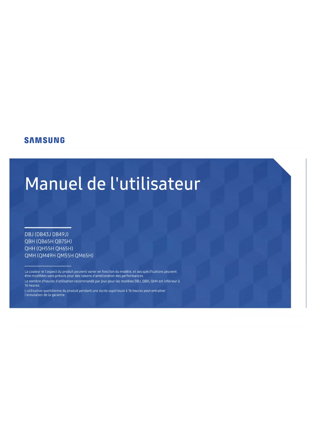 Manuel de l'utilisateur La couleur et l'aspect du produit peuvent varier en fonction du modèle, et ses spécications peuvent être modiées sans préavis pour des raisons d'amélioration des performances. Le nombre d’heures d’utilisation recommandé par jour pour les modèles DBJ, QBH, QHH est inférieur à 16 heures. L'utilisation quotidienne du produit pendant une durée supérieure à 16heures peut entraîner l'annulation de la garantie. DBJ (DB43J DB49J) QBH (QB65H QB75H) QHH (QH55H QH65H) QMH (QM49H QM55H QM65H)Table des matières Avant utilisation du produit Copyright 6 Consignes de sécurité 7 Nettoyage 7 Stockage 8 Électricité et sécurité 8 Installation 9 Fonctionnement 11 Préparatifs Vérification des composants 14 Composants 14 Pièces 15 Panneau de configuration 15 Face arrière 19 Verrou antivol 22 Télécommande 23 Avant d'installer le produit (Guide d'installation) 25 Angle d'inclinaison et rotation 25 Ventilation 25 Installation du support mural 27 Préparation préalable à l'installation du support mural 28 Installation du support mural 28 Spécifications du kit de montage mural (VESA) 29 Télécommande (RS232C) 30 Connexion du câble 30 Branchement 33 Codes de contrôle 34 Connexion et utilisation d'un périphérique source Avant d'effectuer la connexion 42 Points à vérifier avant la connexion 42 Connexion à un PC 42 Connexion à l'aide d'un câble HDMI 42 Connexion à l'aide d'un câble DP 43 Connexion à l'aide d'un câble DVI (type numérique) 43 Connexion à l'aide d'un câble HDMI-DVI 44 Branchement à un moniteur externe 45 Connexion à un appareil vidéo 46 Connexion à l'aide d'un câble HDMI-DVI 46 Connexion à l'aide d'un câble HDMI 47 Branchement à un système audio 47 Guide de connexion du cordon d'alimentation 48 Fixation du boîtier réseau (vendu séparément) 49 Connexion du boîtier réseau (vendus séparément) 50 MagicInfo 50 Modification de la source d'entrée 52 Source 52 Web Browser 53 Espace de travail distant 54 Utilisation de MDC Installation/désinstallation du programme MDC 55 Installation 55 Désinstallation 55 Connexion à MDC 56 Utilisation de MDC via RS-232C (normes de transmission de données série) 56 Utilisation de MDC via Ethernet 57 Fonctionnalités Lecteur Lecteur 59 Visualisation du contenu 59 Pendant la lecture de contenu 60 Menu disponible 60 Formats de fichiers compatibles avec Lecteur 61 Programmation 66 Cloner le produit 67 Paramètres ID 68 ID périphérique 68 Définit. auto ID périph. 68 2Table des matières Câble de connexion au PC 68 Mur d'images 69 Mur d'images 69 Horizontal x Vertical 69 Position écran 70 Format 70 État du réseau 71 Mode Image 72 Progr. act./désact. 73 Progr. activ. 73 Progr. désact. 74 Gestion des vacances 74 Téléscripteur 75 Lancement de l'URL 76 Paramètres du lanceur d'URL 77 Approbation d'un périphérique connecté depuis le serveur 78 Réglage de l'heure 79 Réglage de l'écran Mode Image 80 Rétroéclairage / Contraste / Luminosité / Netteté / Couleur / Teinte (V/R)
